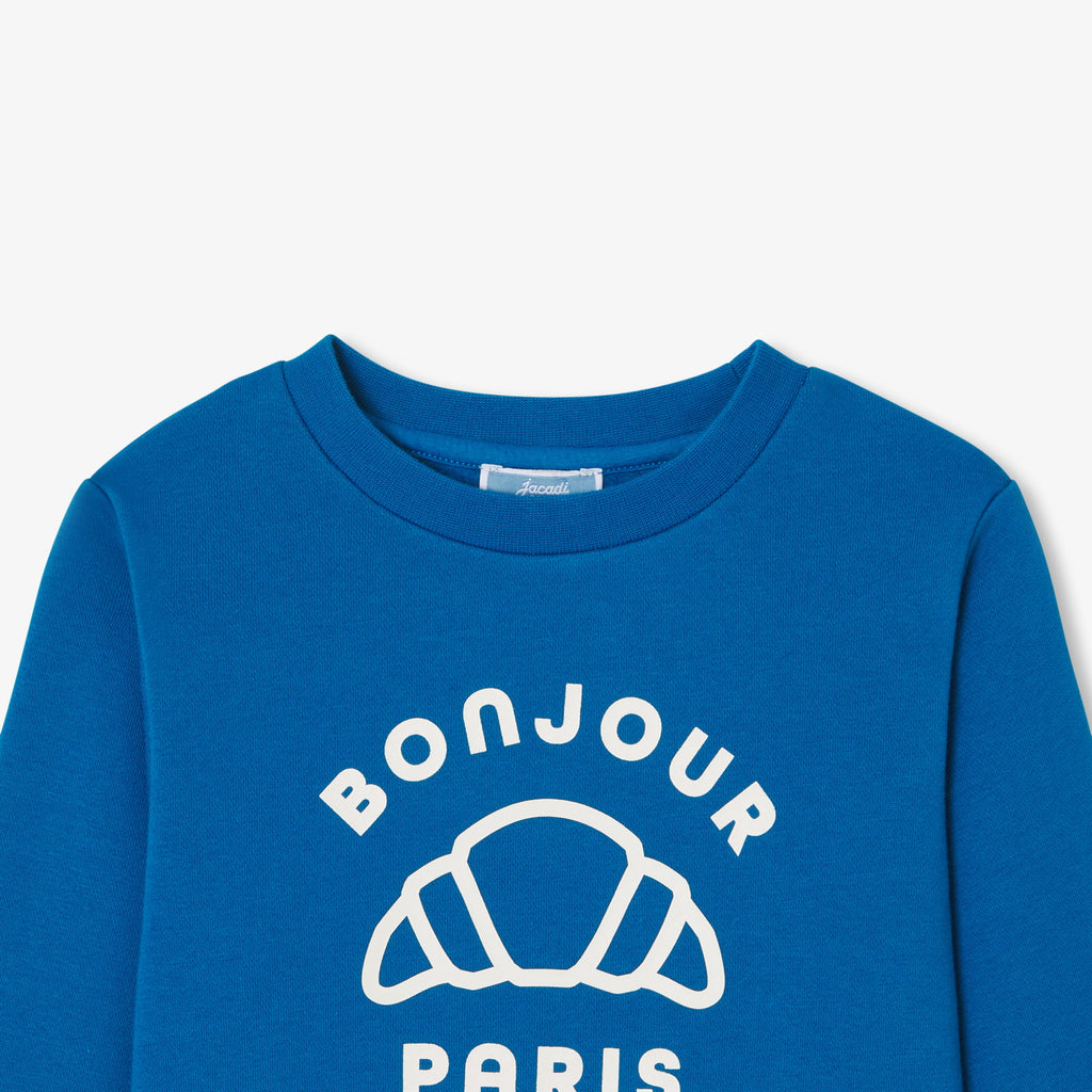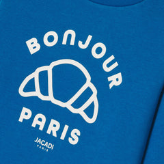 エンボス加工のクロワッサンと"Bonjour Paris"のメッセージが目を惹くスウェット。フランスのアフタヌーンスナックをイメージした、暖かなフリース裏地付きのモダンなデザイン。きっとお子さまのお気に入りの一着に。