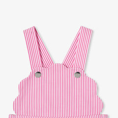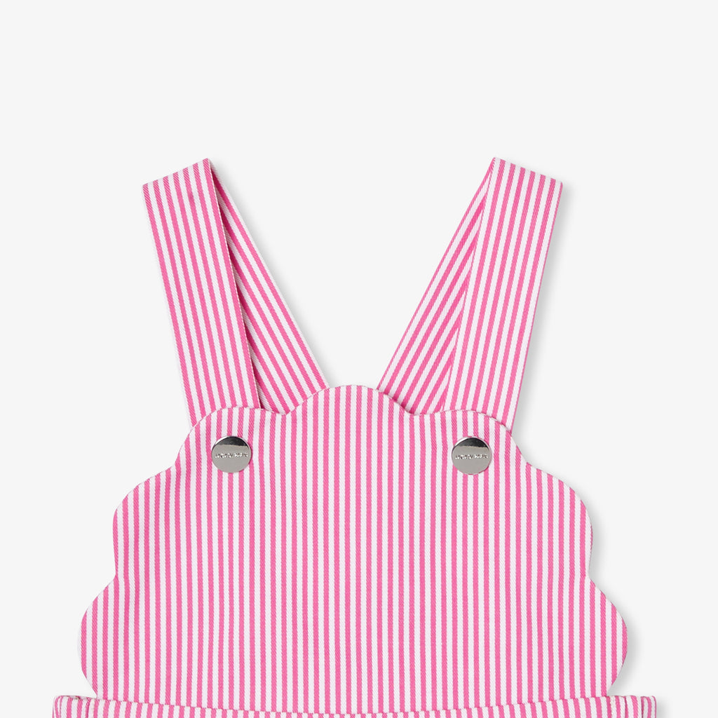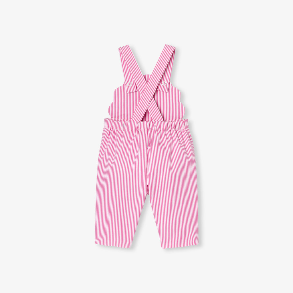 タイムレスなサロペットをおしゃれにリデザイン。ストライプのツイル生地を使用し、スカラップの胸当てとバッククロスストラップがポイントに。ニットの裏地付きで着心地が良く、股下のスナップボタンで着脱も簡単。ピーターパンカラー(襟)付きのボディスーツとカーディガンと合わせてみて。