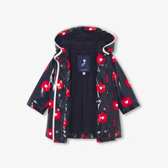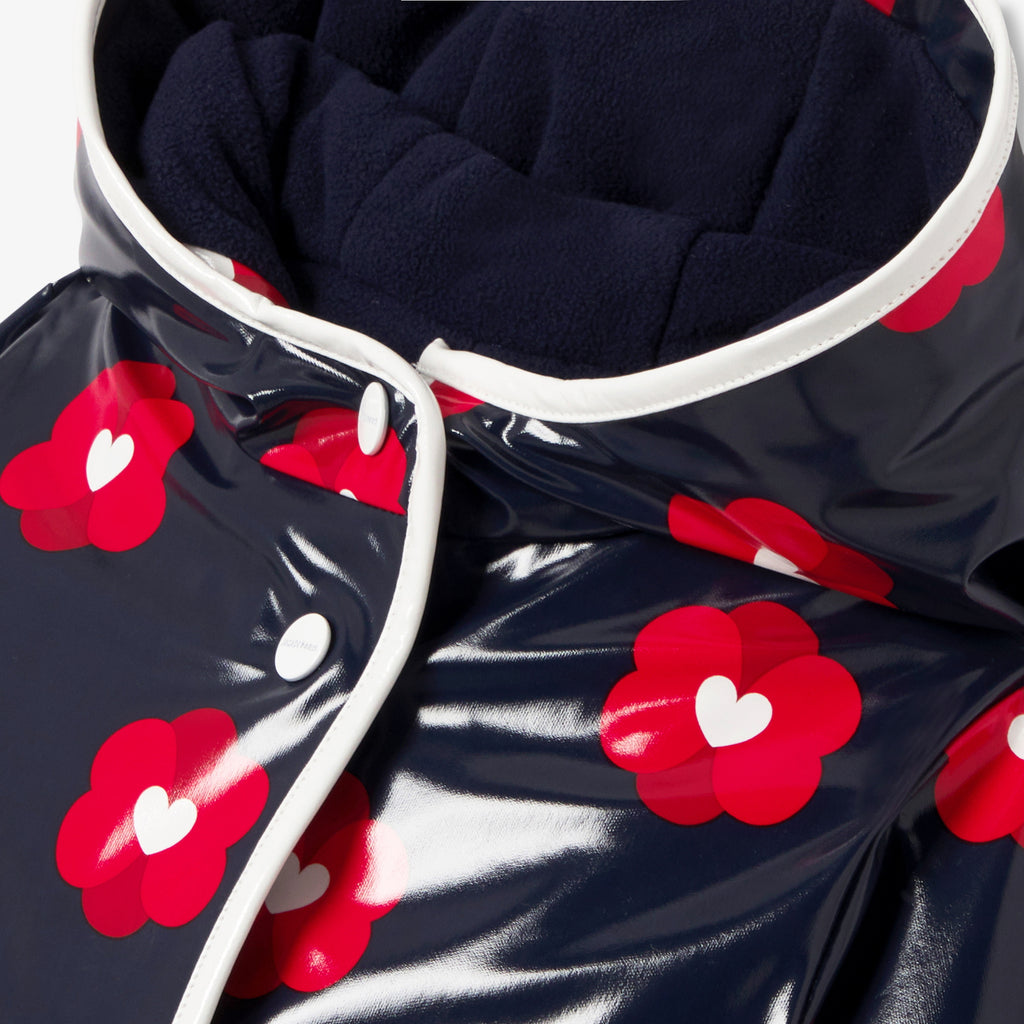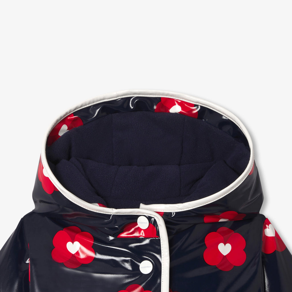 今シーズン新たに登場したレインコート。パテントキャンバス素材を使用し、これまで以上にシックに仕上げました。コレクションに共通するポップな花のモチーフと、コントラストの効いたパイピングで飾られています。裏地はマイクロフリースで、ファスナーとスナップボタンで開閉できます。雨の日にぴったりのレインコートです。