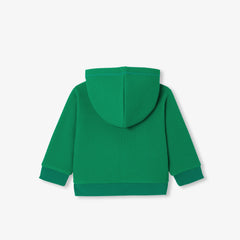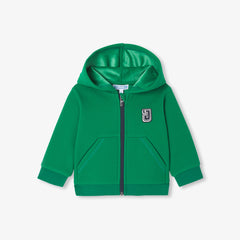 プレッピーでスポーティー、そしてカラフルなジップアップスウェット。通園に最適です。ソフトでしなやかなフリース素材を使用しました。フード、胸元の刺しゅうバッジ、カンガルーポケット、コントラストの効いたファスナーが都会的なデイリーウェアです。