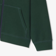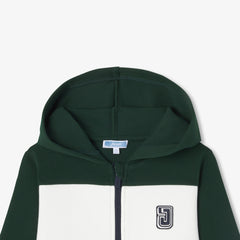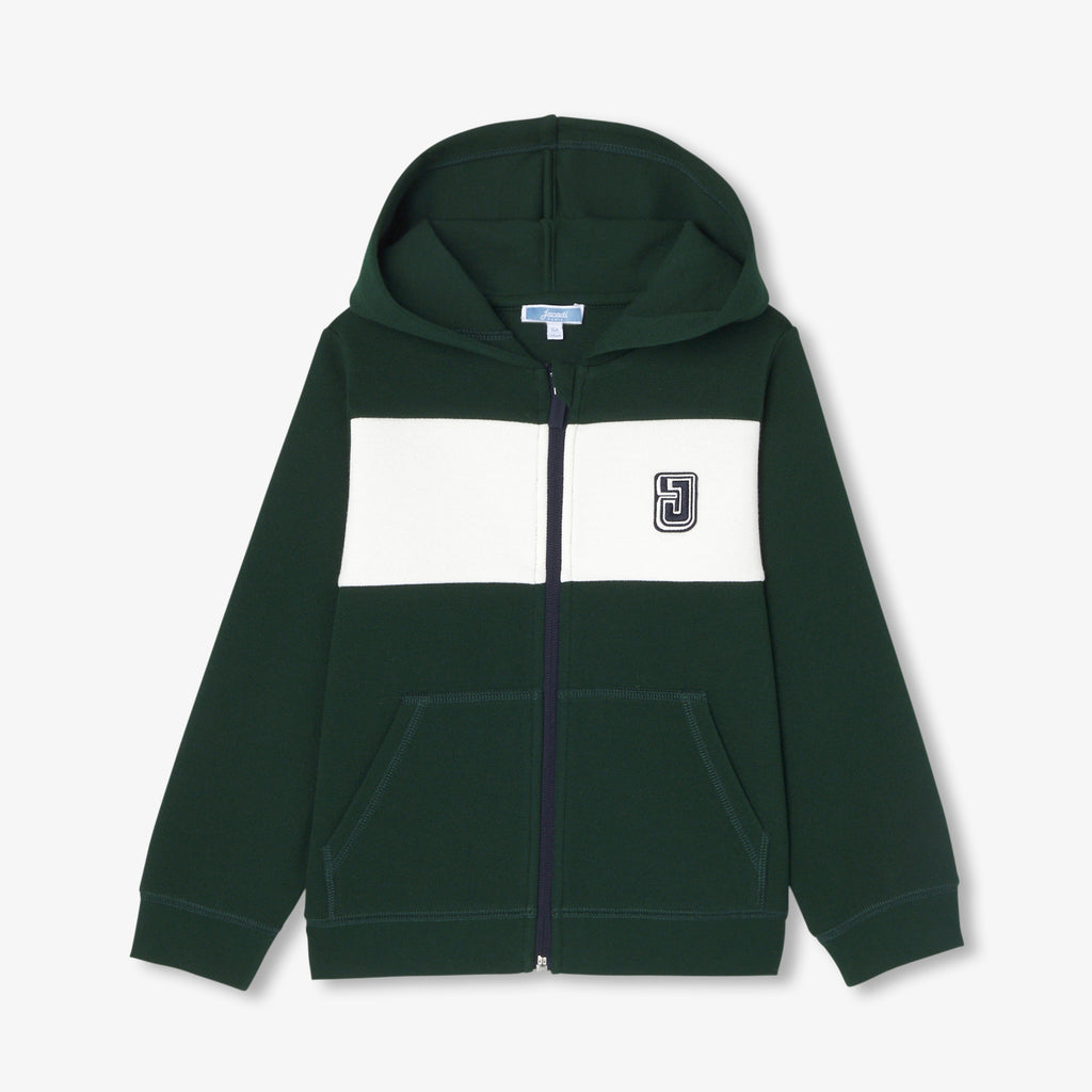 キャンパスムード漂うモダンなファスナー付きスウェット。コットンピケの裏地にジャージー素材を使用し、着心地と柔軟性も抜群。コントラストの効いたストライプと胸元の"J"の刺しゅうが、お子さまに大人気の都会的なモデルです。お揃いのスウェットパンツ(別売り)やジーンズと合わせて着こなせば、新学期に大活躍。