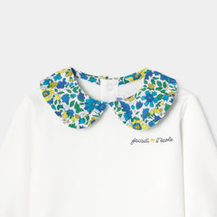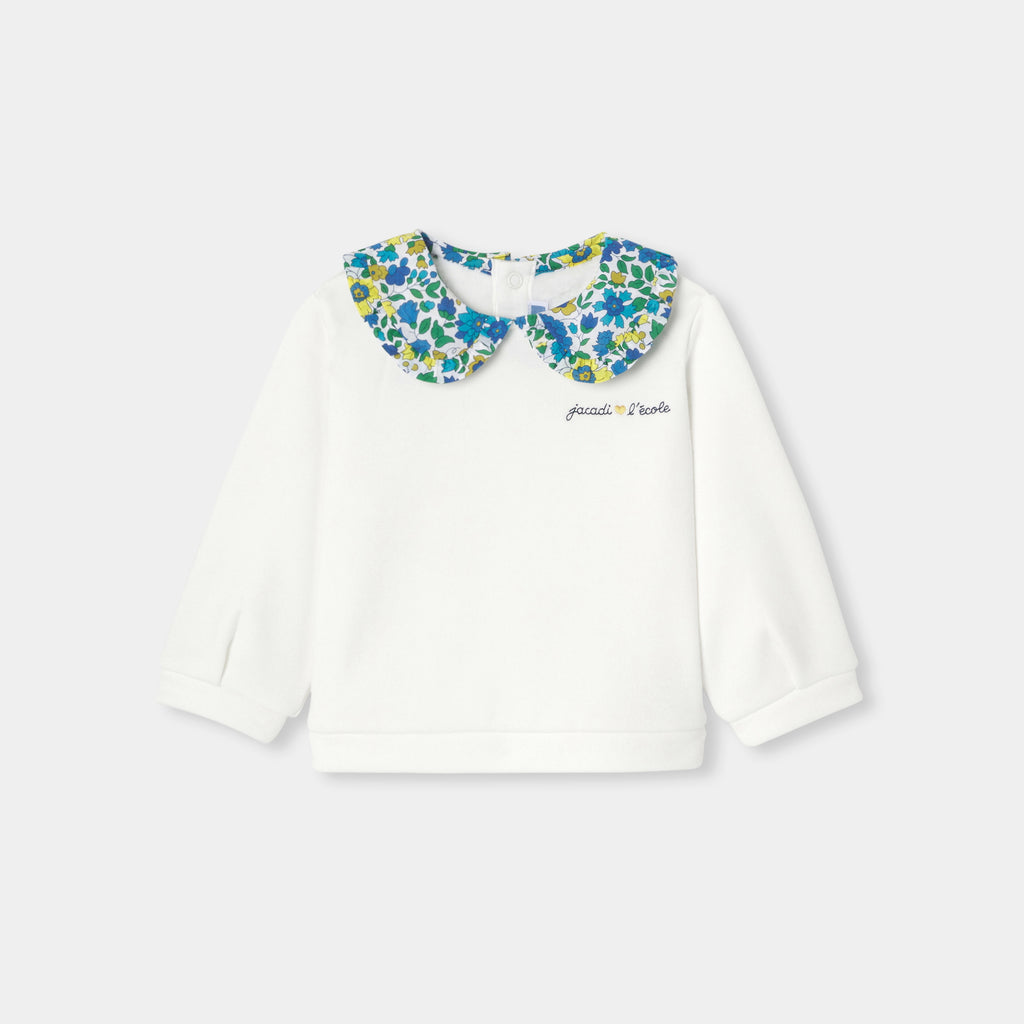 リバティプリント(花柄)のピーターパンカラー(襟)がロマンティックな魅力を添える、柔らかなフリース素材のセーター。背中のスナップボタンで着脱も簡単。ショートパンツやジーンズと合わせて、秋のデイリースタイルに。