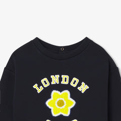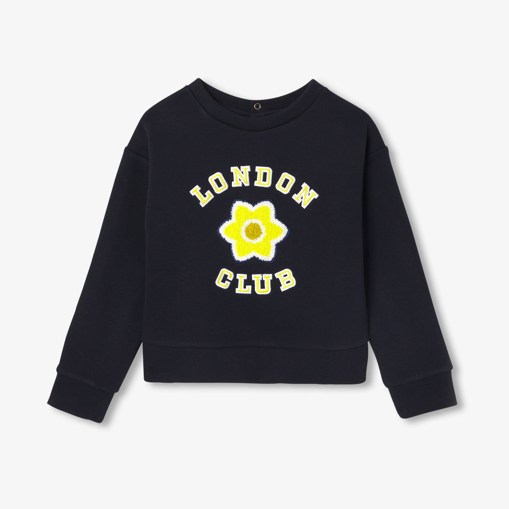 カジュアルで都会的なスウェットはマストアイテムです。起毛したフリース素材に、花の刺しゅうバッジと "London Club"の文字がエネルギッシュなモデルです。ベロア調生地のスカートやワイドレッグのジーンズと合わせれば、プレッピーなカレッジ風コーディネートに。