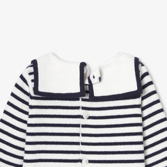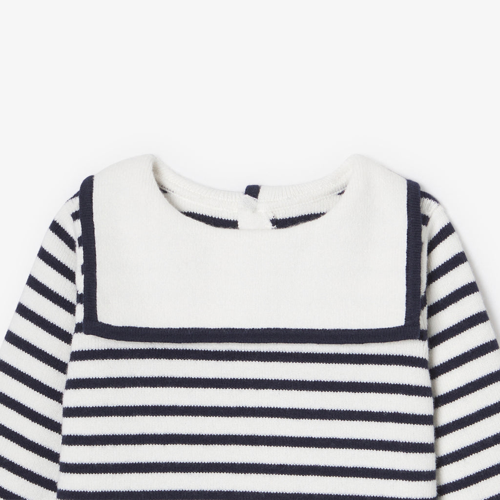 エレガンス、タイムレスな魅力、着心地の良さのバランスが絶妙なニットアンサンブル。柔らかでカバー力のある素材を使用しており、背面開きのストライプのトップスと、伸縮性のあるウエストゴム入りの無地パンツが上下セットに。セーラーカラー(襟)がアクセントになったカジュアルシックなモデルです。赤ちゃんのワードローブに選んでみて。