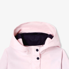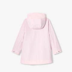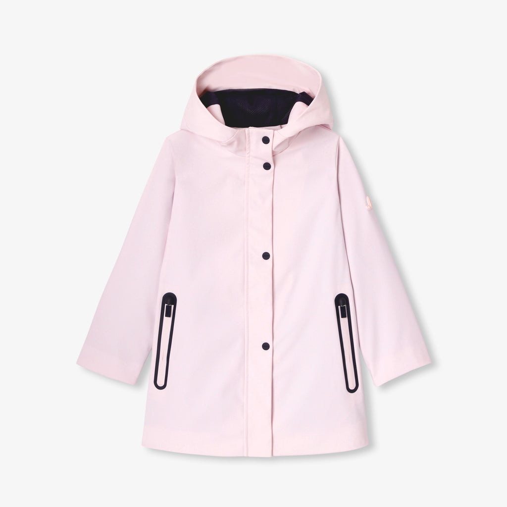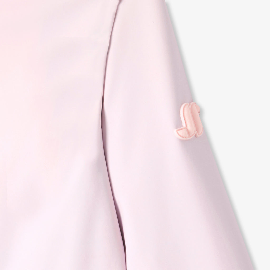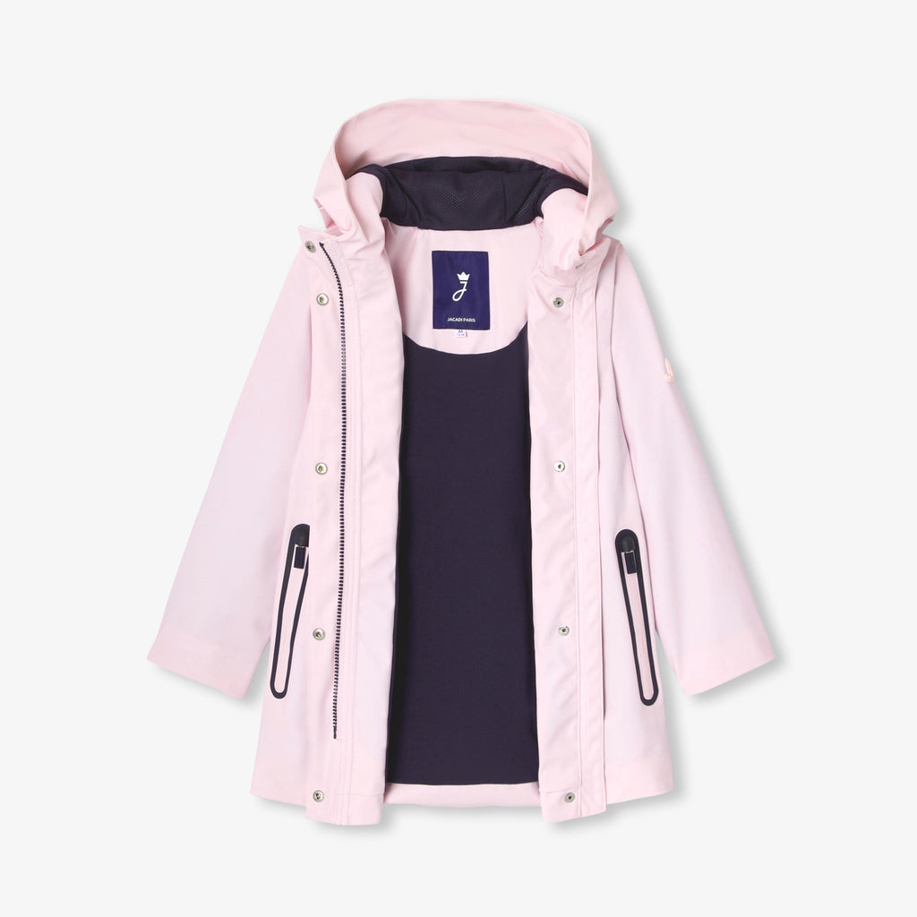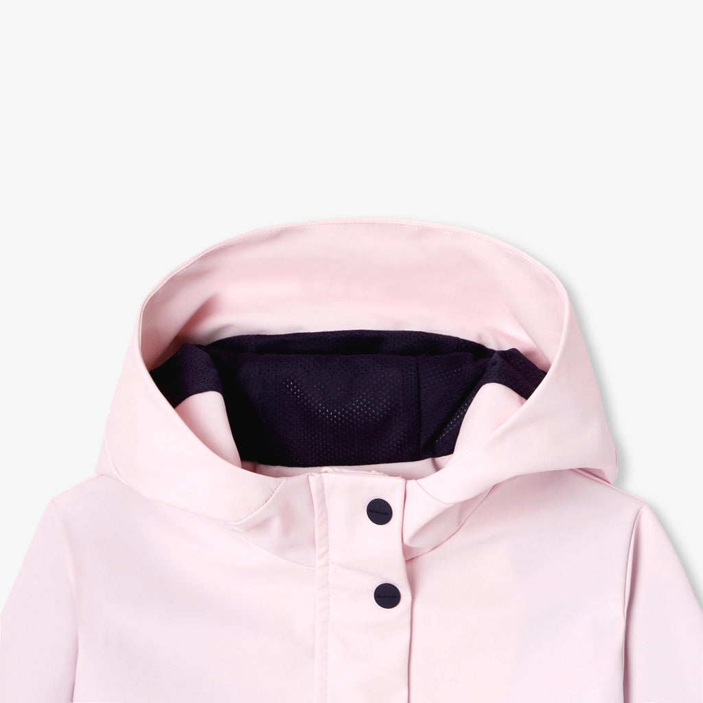 今シーズンのパーカーは、モダンなパウダーピンクの生地にラバー加工を施しました。撥水性があり軽量で、裏地には肌ざわりのよいジャージー素材を使用。雨の日はもちろん、スポーティシックで都会的なコーディネートにも。コントラストの効いたファスナー付きポケットと袖の刺しゅうバッジがアクセントの、新学期にぴったりの一着です。