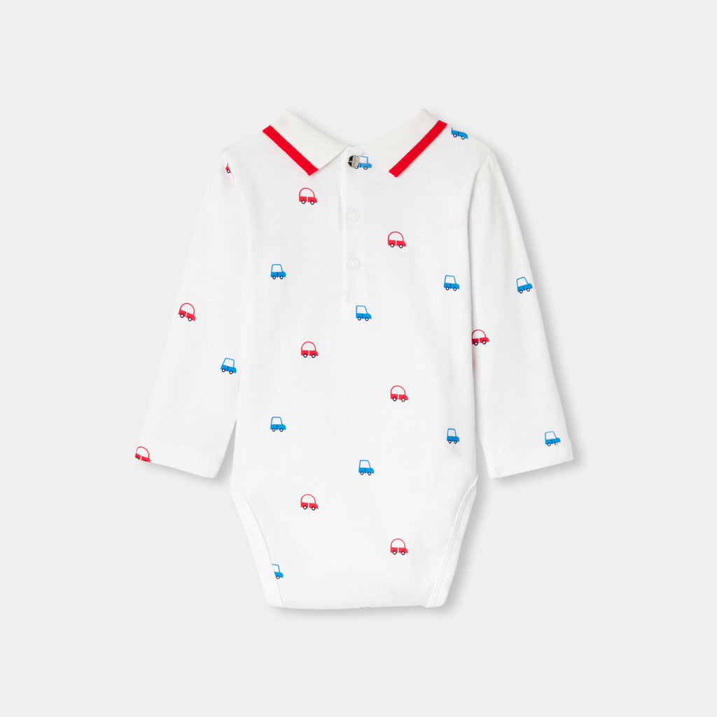 カジュアルシックで着心地の良い、ポロシャツ風ボディスーツ。ストライプのポロ襟と小さな車のモチーフが特徴の定番アイテムです。実用的で着脱も簡単。ジーンズやサロペットに合わせて。