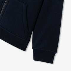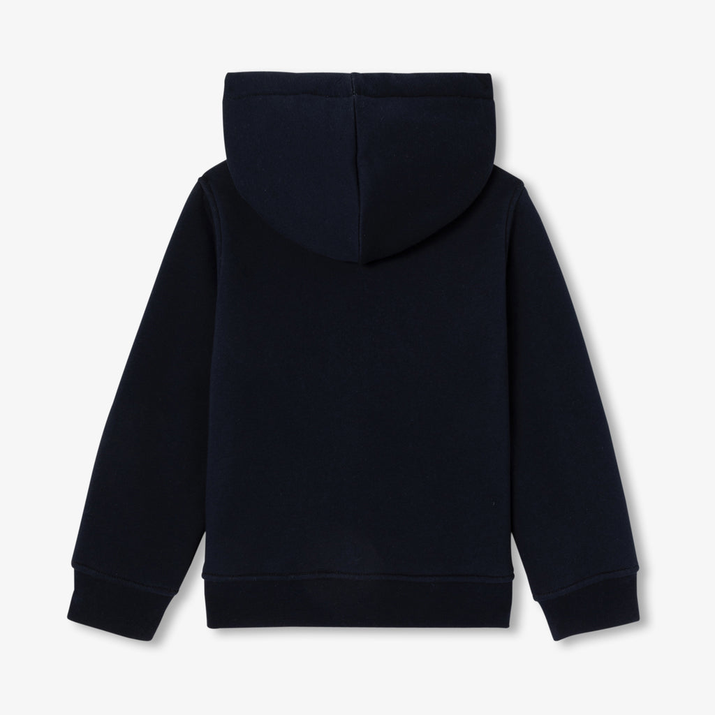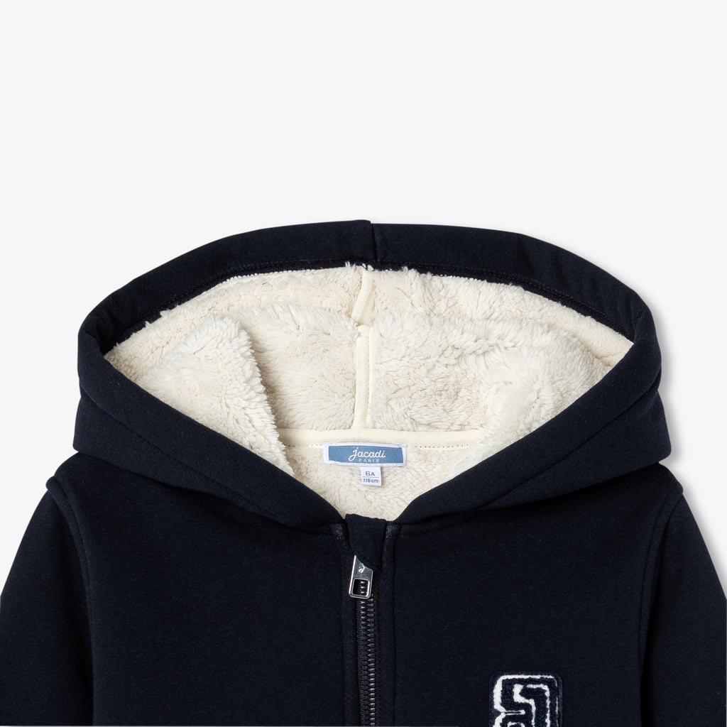 スポーティーでシック、そして着心地の良いジップアップスウェット。英国カレッジ風の刺しゅうバッジが目を惹きます。表地にはフリース、裏地にはコントラストの効いたフェイクファーを使用しました。秋には長袖Tシャツの上に羽織り、裏地付きパンツを合わせるのがおすすめ。