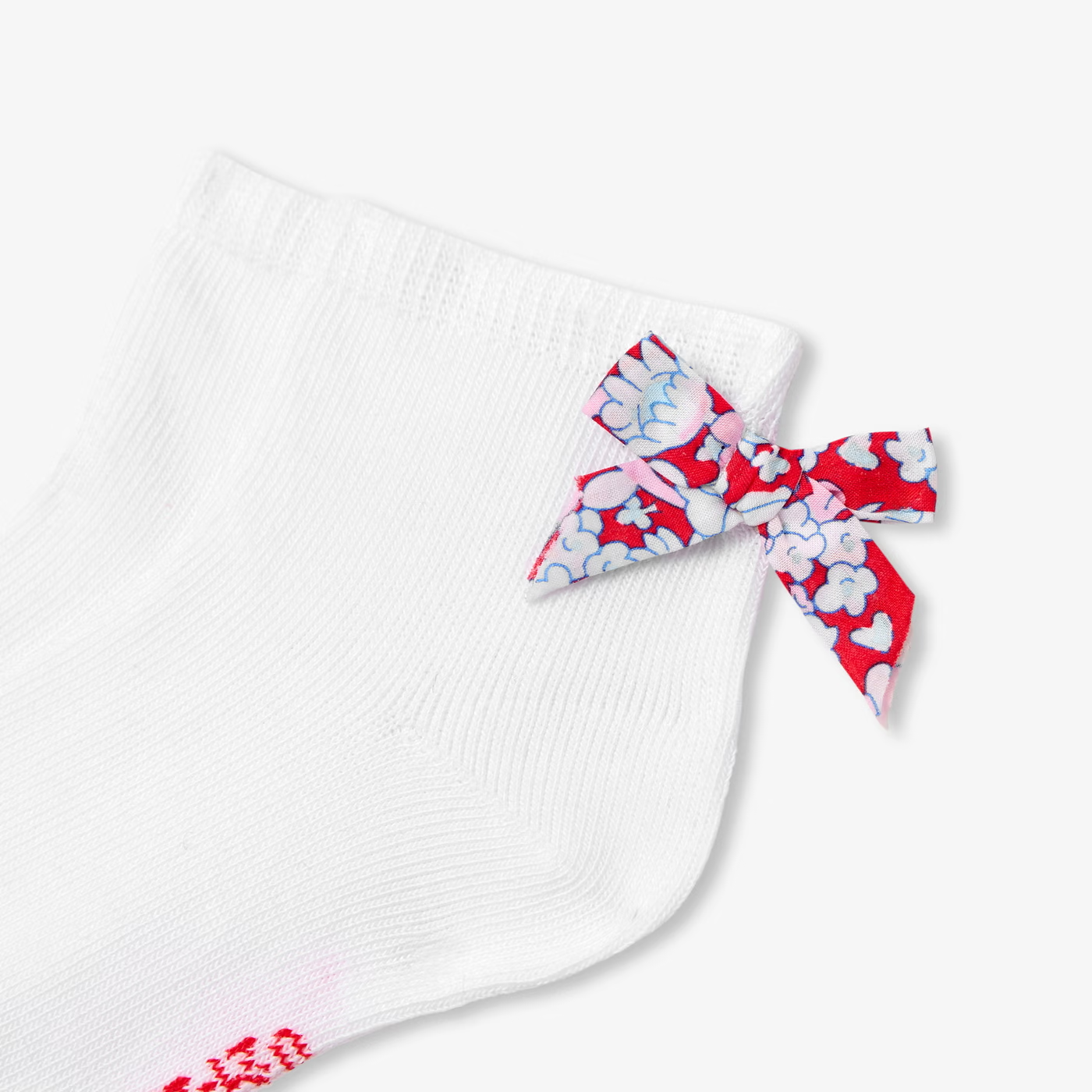 足首の後ろにリバティプリント(花柄)のリボンをあしらった靴下。サンダルやスニーカーと合わせれば、毎日のコーディネートが可愛らしく仕上がります。