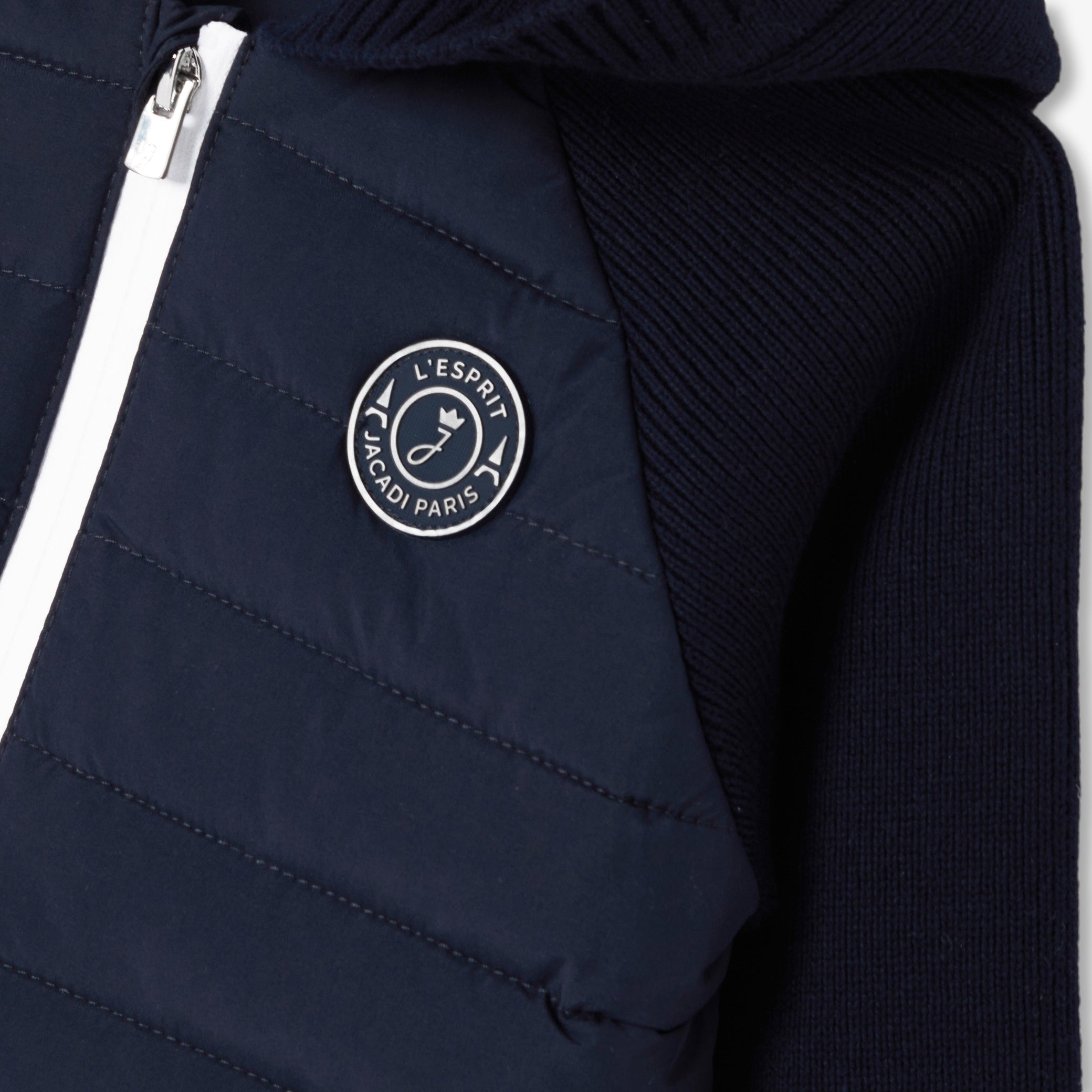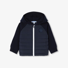 シーズン初めのアウターとしてデザインされた、丁寧な仕立てが魅力の一枚です。中綿入りのナイロンを使用したユニークなスタイル。袖とフードには柔らかく着心地の良いニット素材を使用しました。
