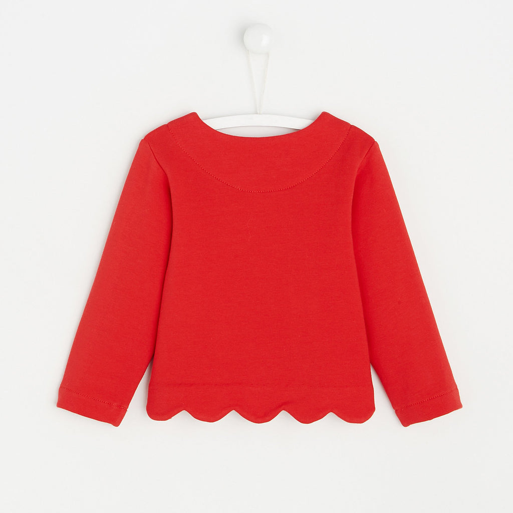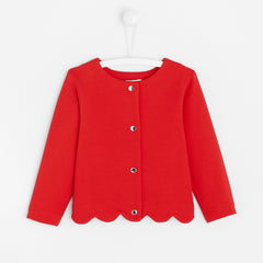 ジャカディの定番、スカラップ裾がアイコニックなカーディガン。肌触りの良いフリース素材を使用し、内側には柔らかいブラッシュ加工が施されています。裾のスカラップデザインがモダンな印象を与え、スナップボタンで着脱も簡単。合わせやすいカラーバリエーションで、ドレスやブラウスとの相性も抜群です。