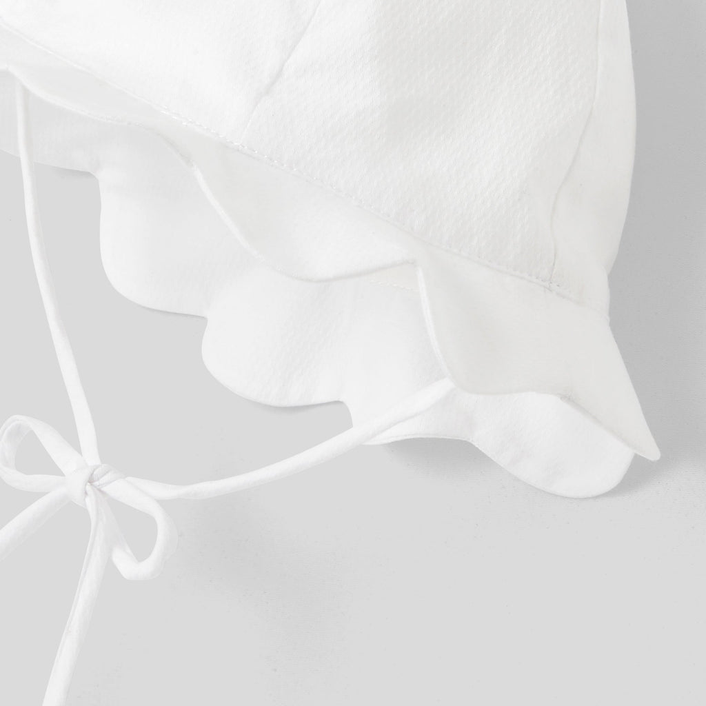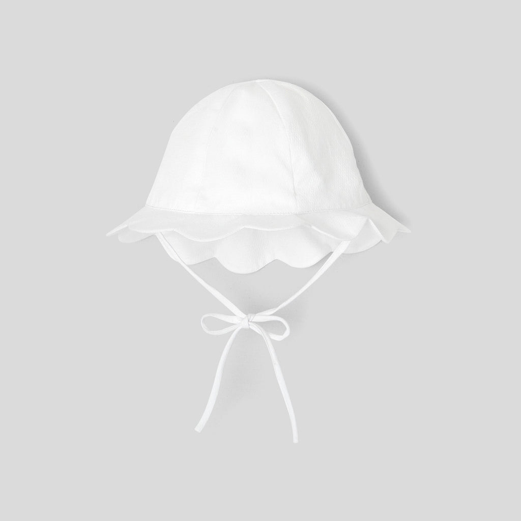 スカラップ縁が可愛らしいコットンハット。太陽の日差しからお子さまを守ります。シンプルなデザインでお洋服に合わせやすいアイテムです。