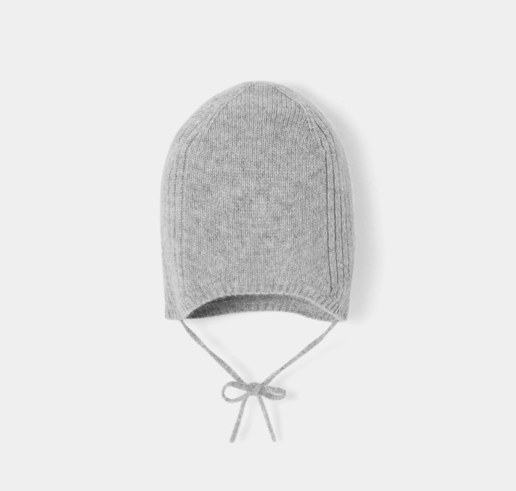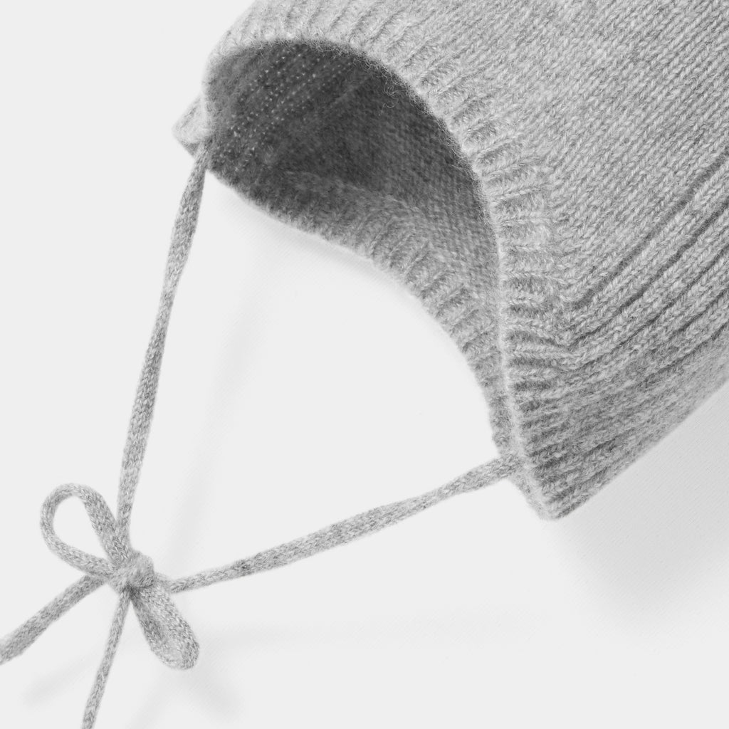 ごきょうだいでも長く着用していただけるようにデザインされた紐付きのカシミアニット帽子。ジャンプスーツやカシミアのブーティと合わせれば、素敵な出産祝いのギフトに。