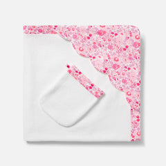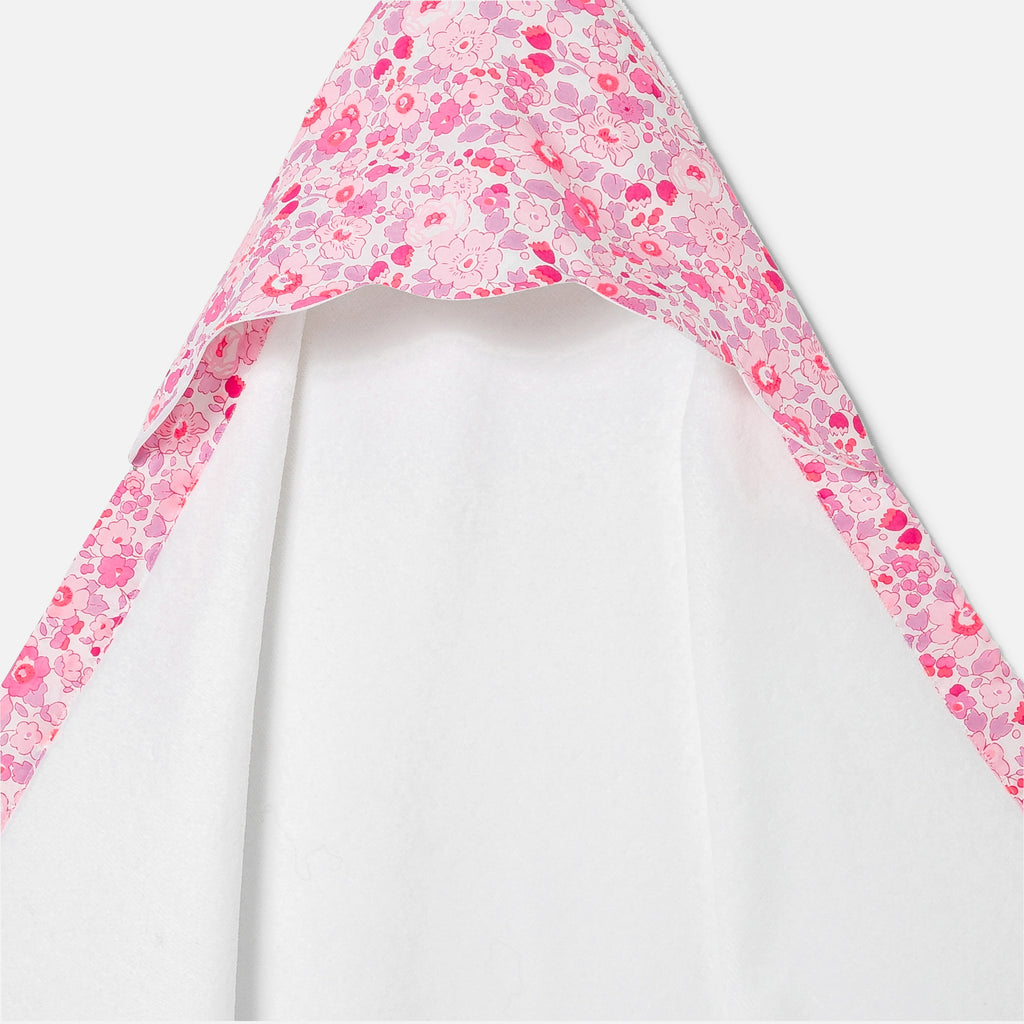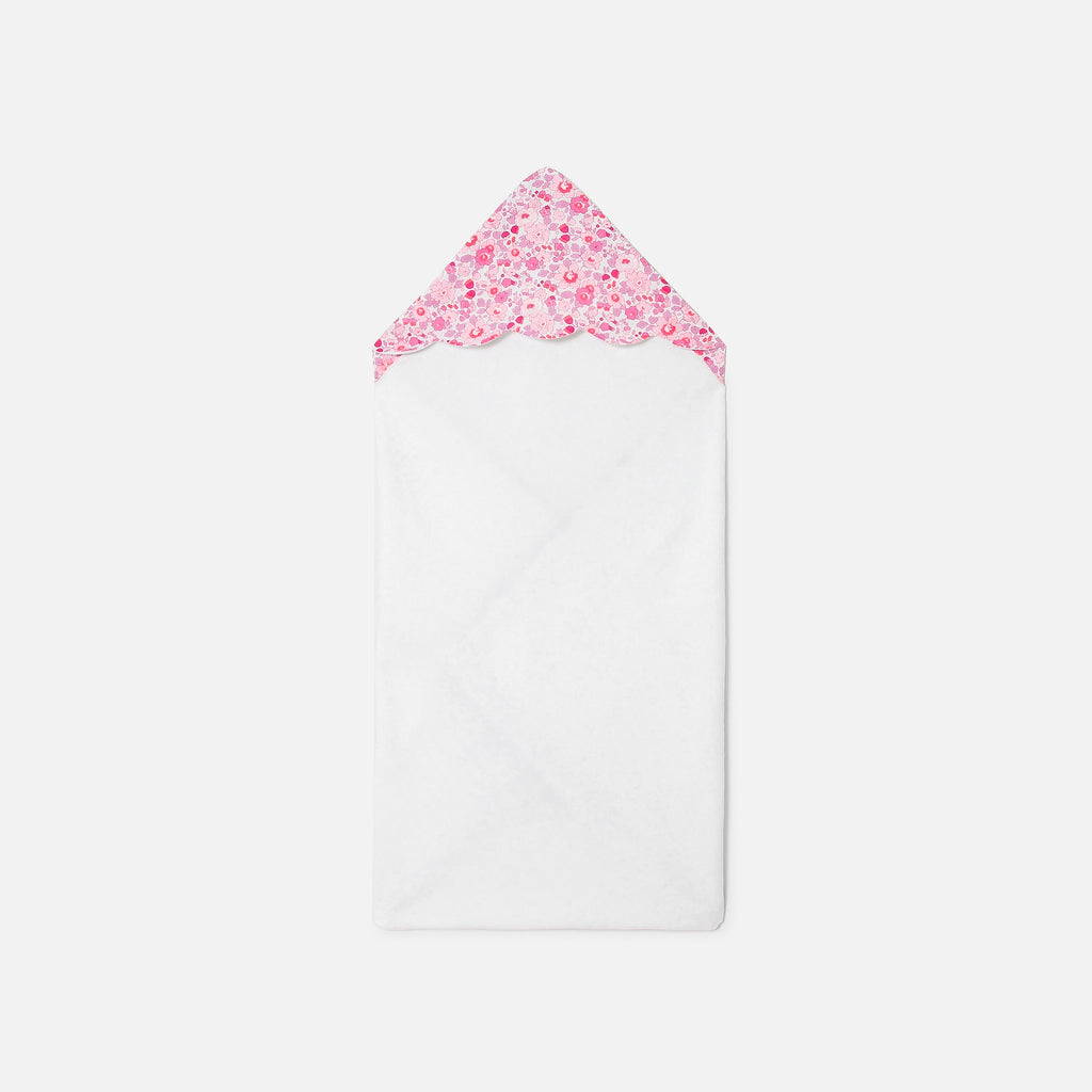 お風呂あがりの赤ちゃんを包み込む、スタイリッシュなバスケープ。柔らかなテリー織コットンを使用しており、スカラップのフード、リバティプリント(花柄)がポイントに。お揃いのミトンがセットになったアイテムで、ご出産後からすぐにお使いいただけます。ご自宅用にもギフトにもおすすめ。