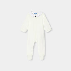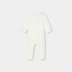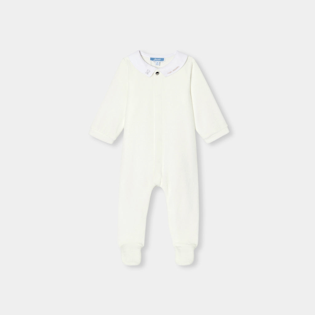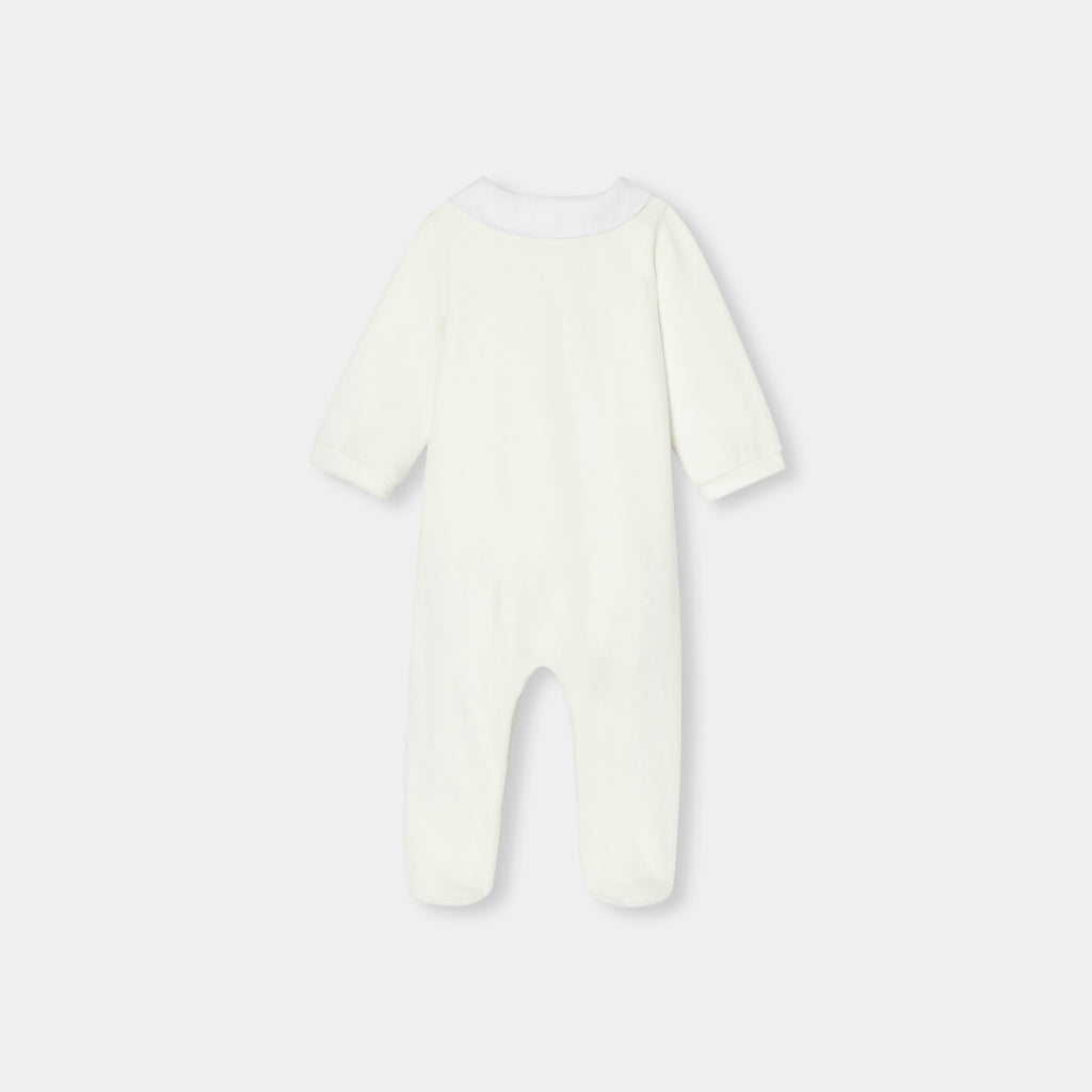 シックでミニマルなシルエットが美しい、シンプルなデザインの足つきロンパース・パジャマ。ご出産後からすぐにお使いいただける必需品で、着脱の簡単な前開きのアイテムです。柔らかでしなやかなベロア調生地を使用しており、クマの赤ちゃんと文字刺しゅうをあしらったポプリン襟がキュート。お昼寝やナイトタイムに活躍しそう。