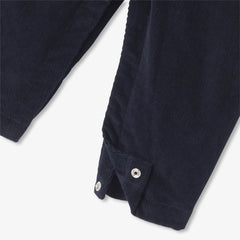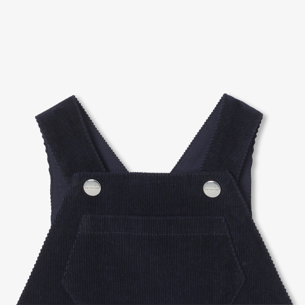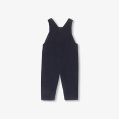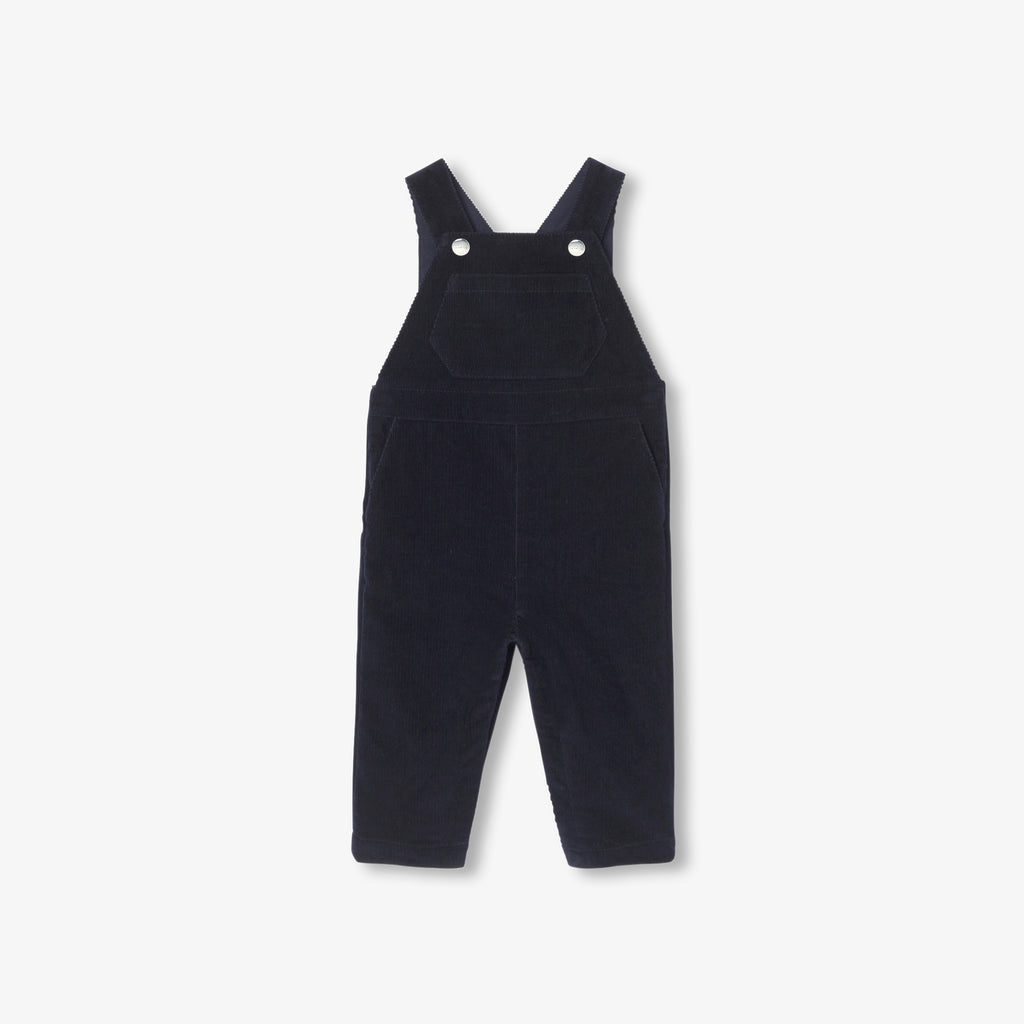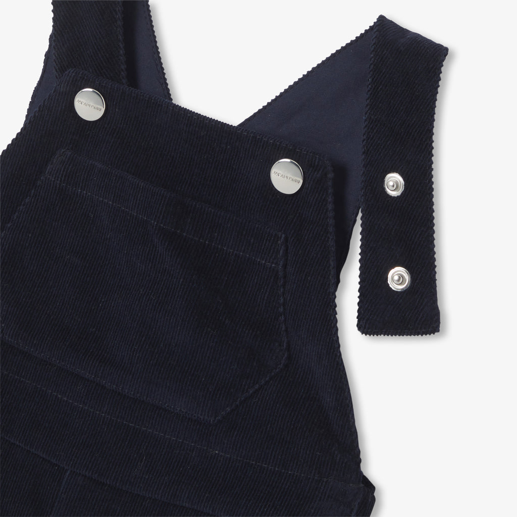 通園におすすめな、フレンチタッチなサロペット。ジャカディらしい一着です。ベロア調生地にストライプのコットン裏地を施し、快適な着心地とカバー力を実現しました。季節の始まりには、ボディスーツとパーカーに合わせて。