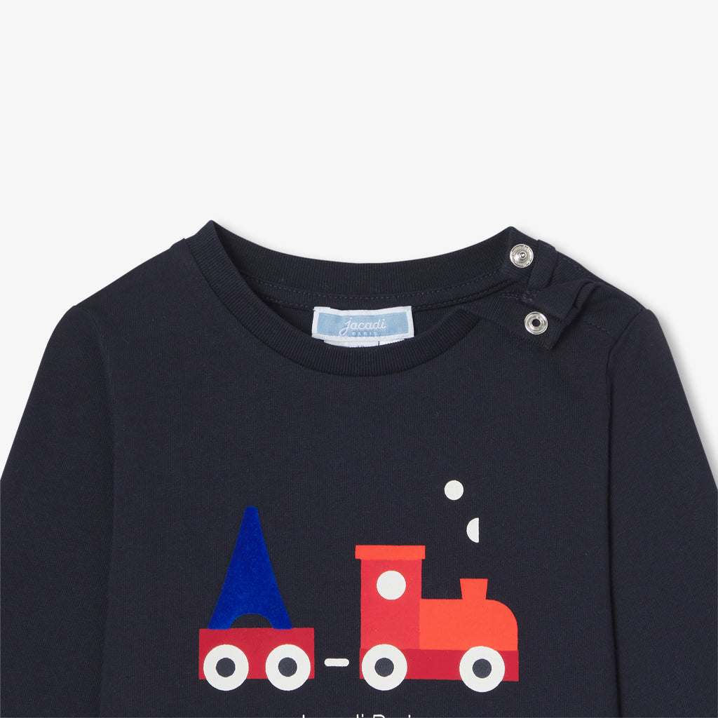 小さな赤い列車がパリの中心を走り抜ける、毎日のワードローブに欠かせないTシャツ。オーガニックコットンを使用しています。肩のスナップボタンで開閉でき、着脱も簡単。ロールアップしたベロアパンツとスニーカーを合わせて、都会的な着こなしを楽しんで。