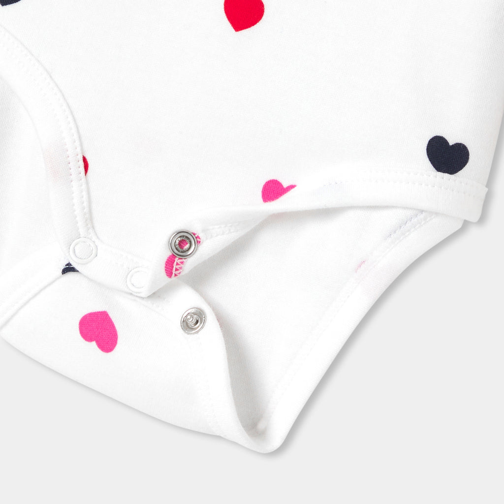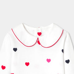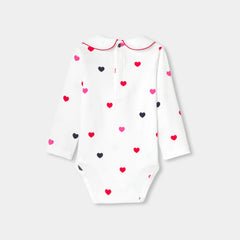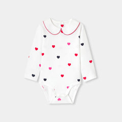赤ちゃんの毎日におしゃれな遊び心を約束する長袖ボディスーツ。ソフトでしなやかなインターロックコットンを使用し、マルチカラーのハートと、コントラストの効いたパイピングをあしらったピーターパンカラー(襟)が魅力のマストアイテムです。