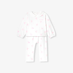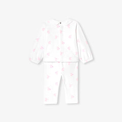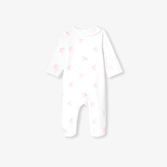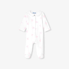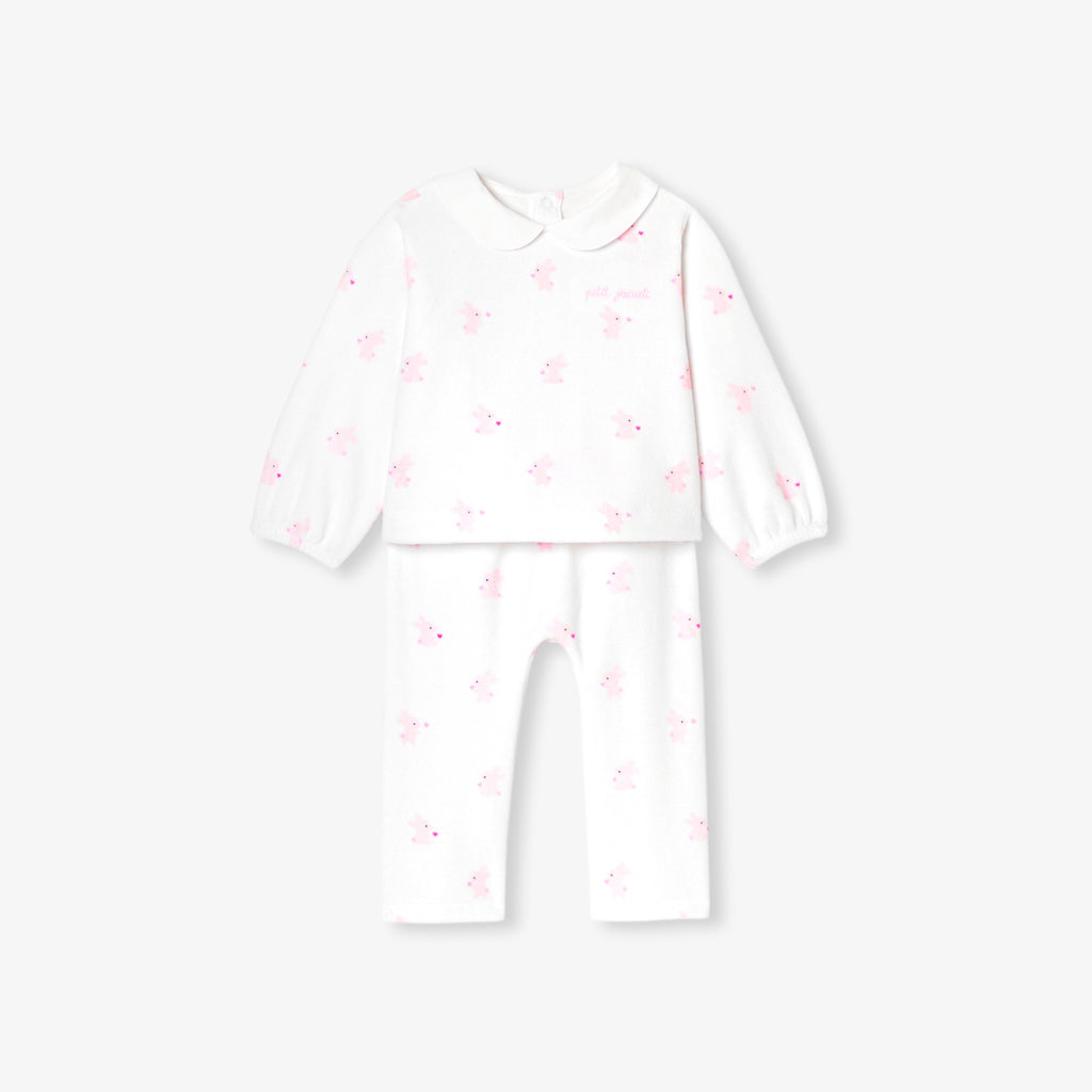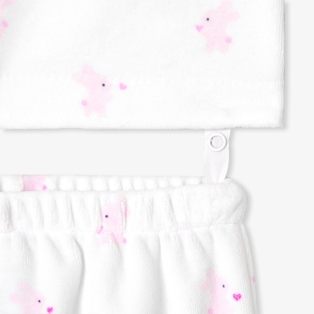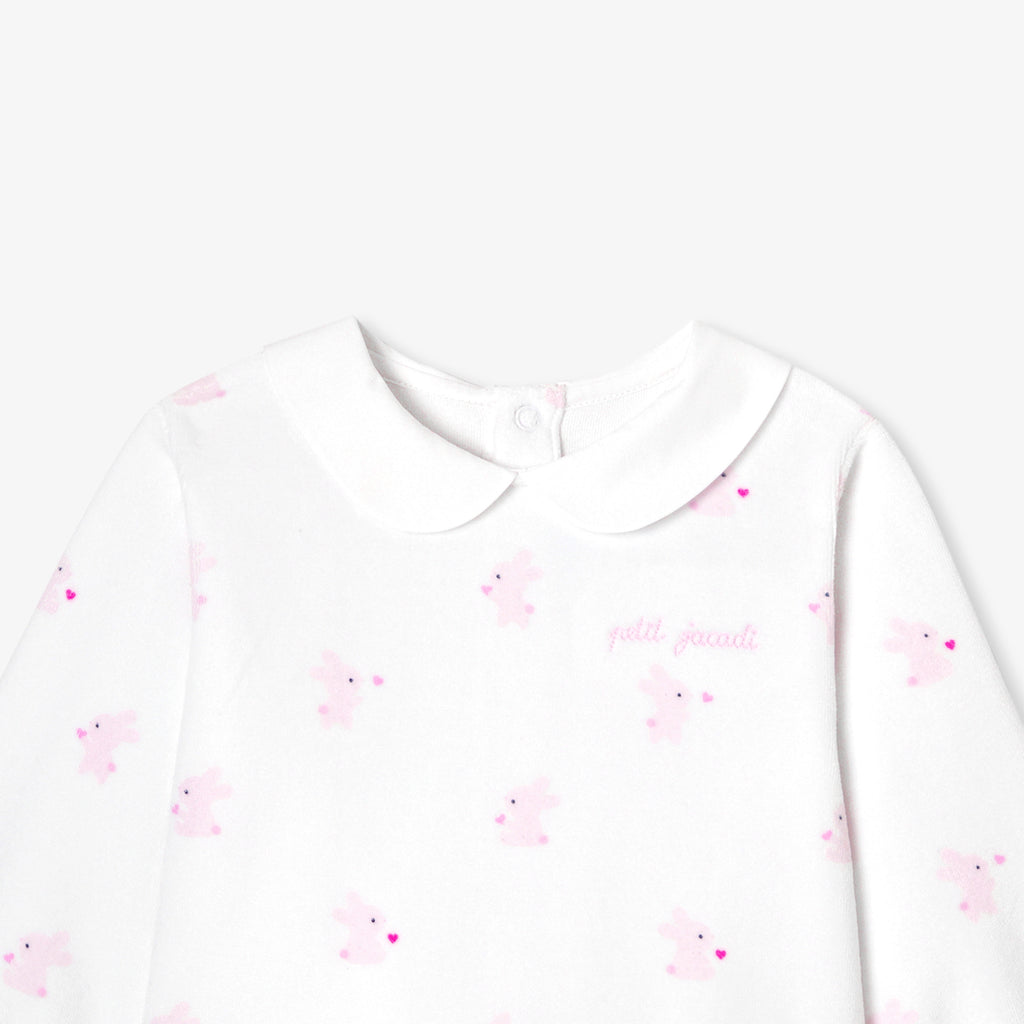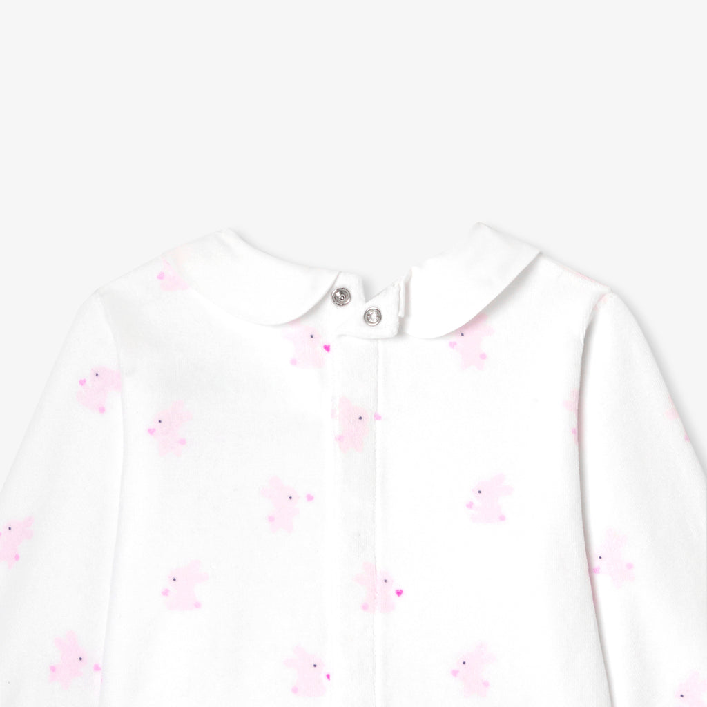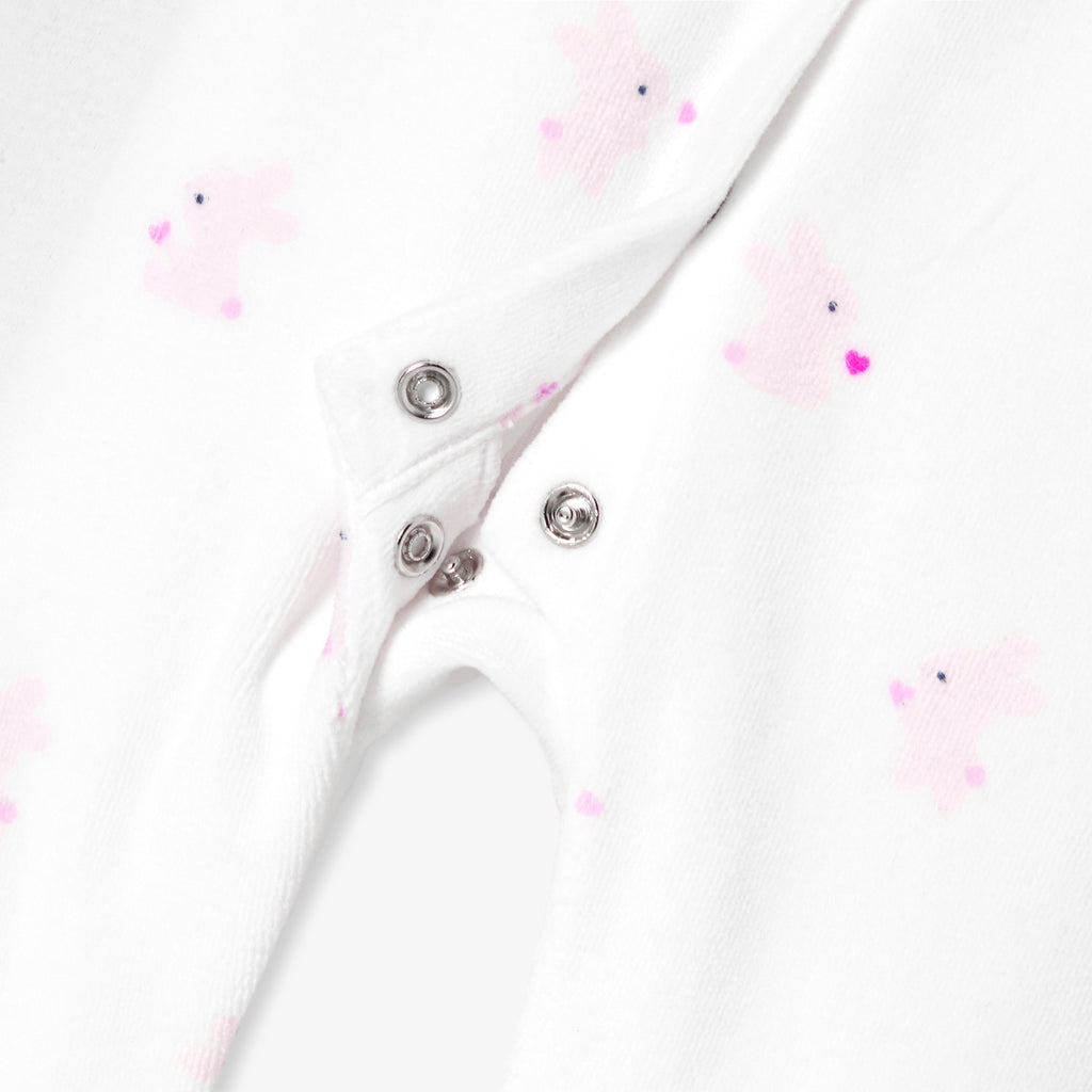 ベロア調生地の柔らかさと可愛らしいモチーフが魅力の足つきロンパース・パジャマ。しなやかな着心地で、ポプリン襟と小さなウサギのモチーフがポイントに。前開きで着脱も安心・簡単、ファーストセットにぴったりのアイテムです。18M、24Mサイズは、胸元に刺しゅうが入ったセパレートの足なしタイプをご用意しています。