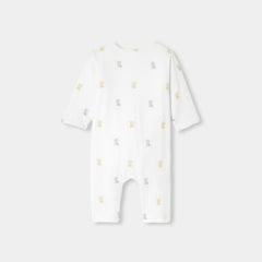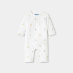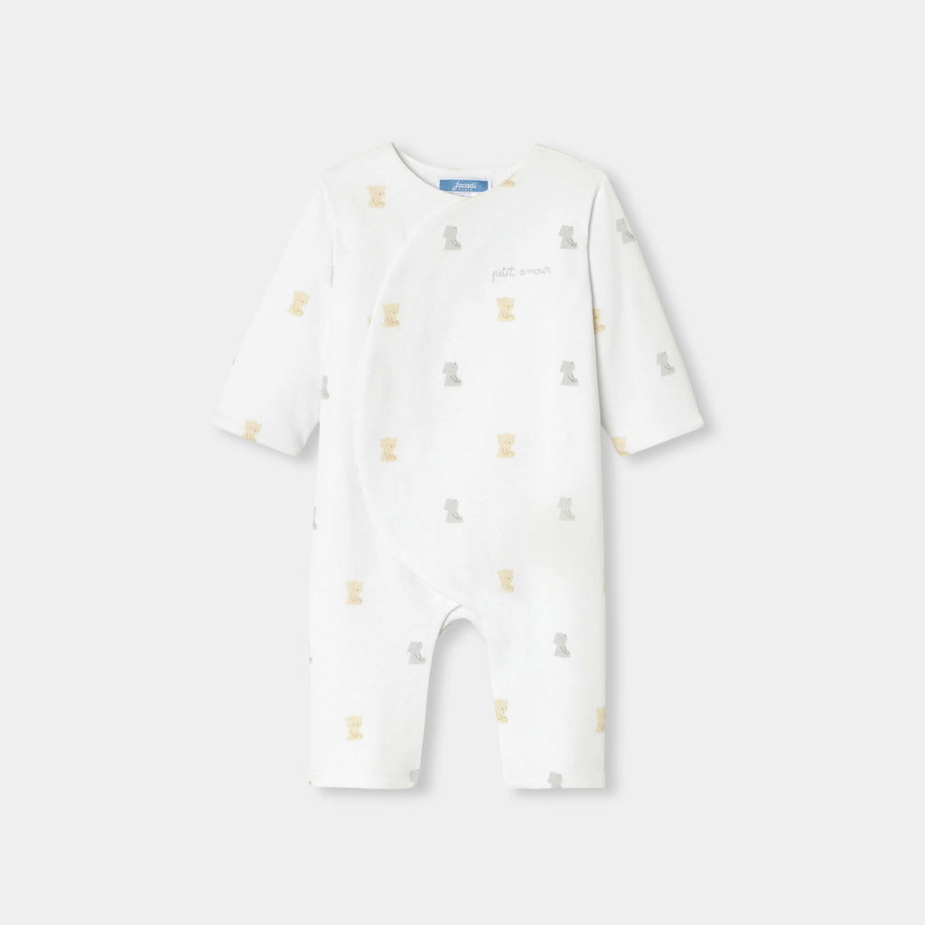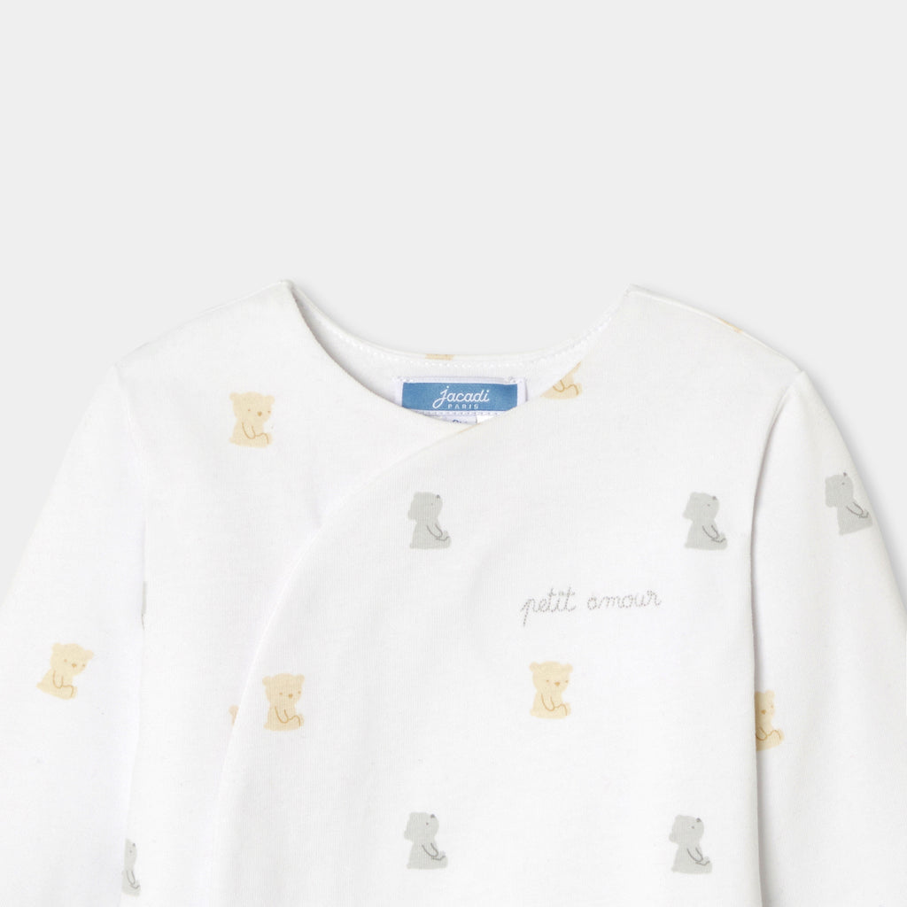 モダンな美しさと実用性を備えた、オーガニックコットン製のニットロンパース。柔らかで着心地の良い中綿入りのジャージー素材を使用した、デイリーユースしやすい一着です。着脱の簡単な巻きスタイルが特徴で、小さなテディベアと文字刺しゅうが可愛らしく、ご自宅用にもギフトにもおすすめ。ファーストセットに選んでみて。