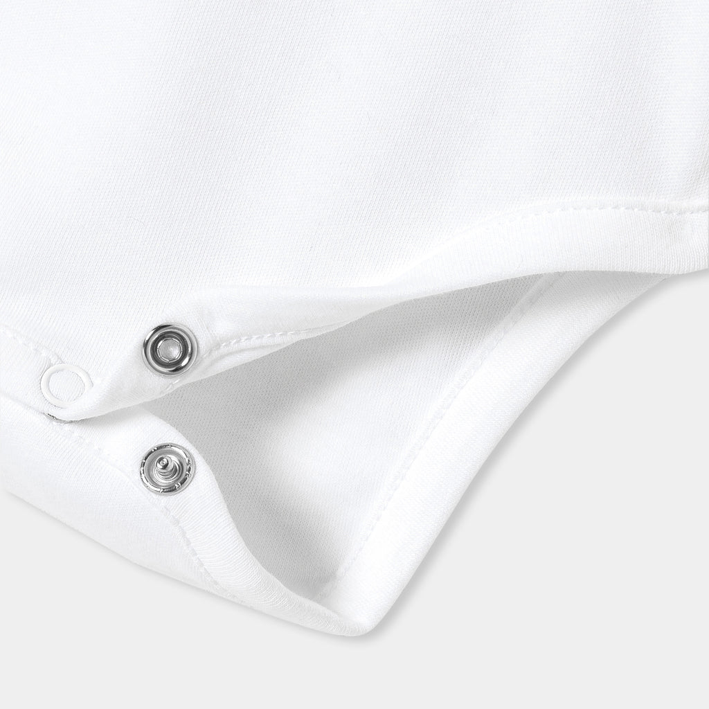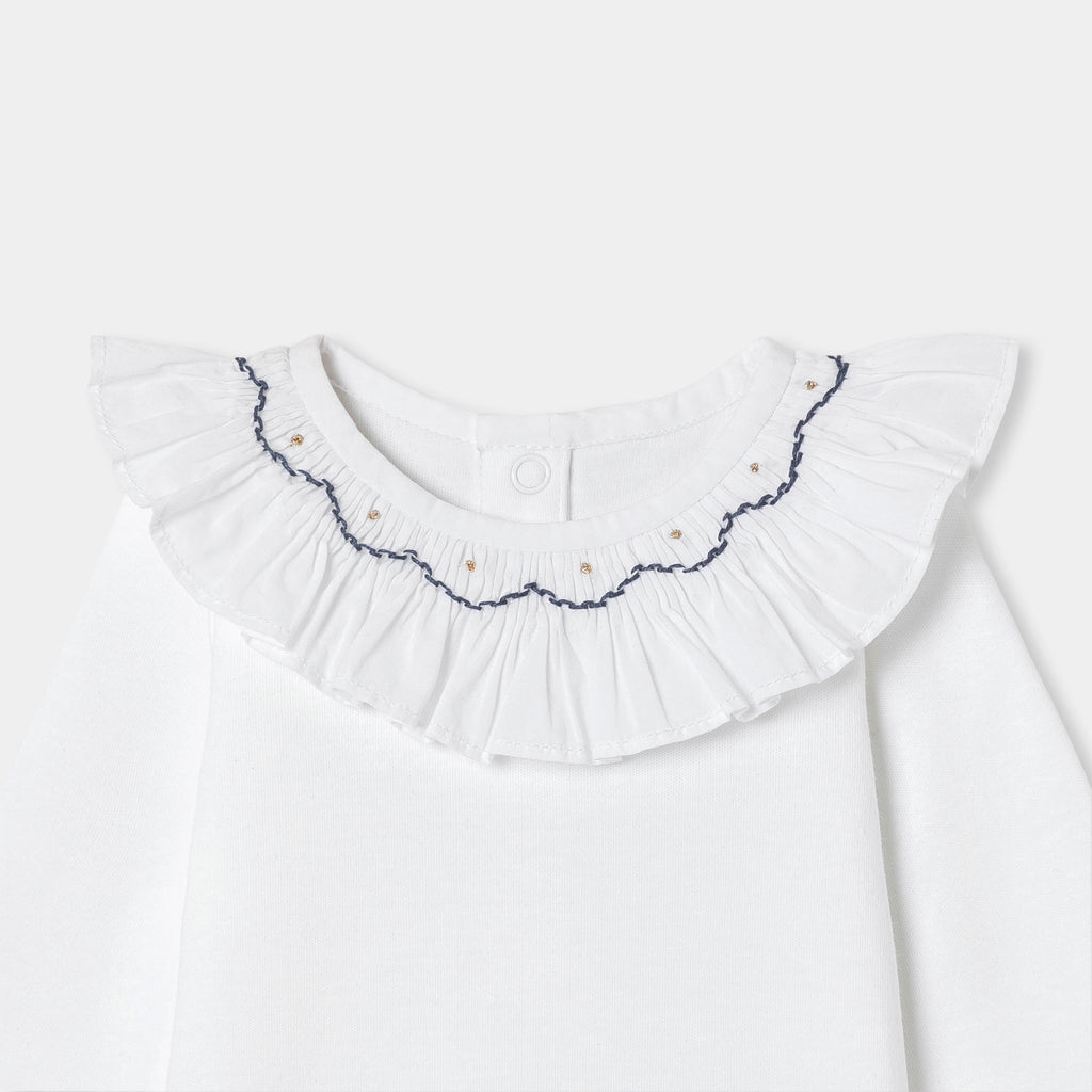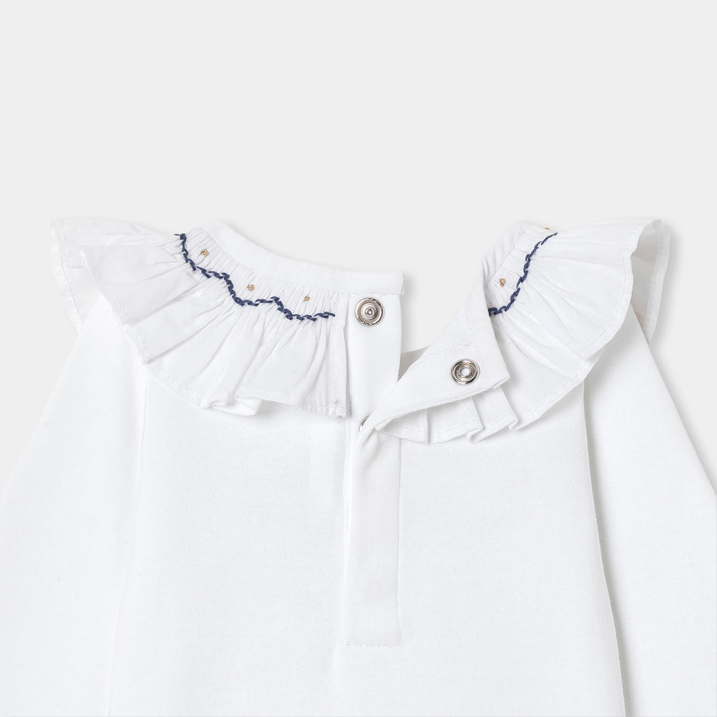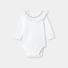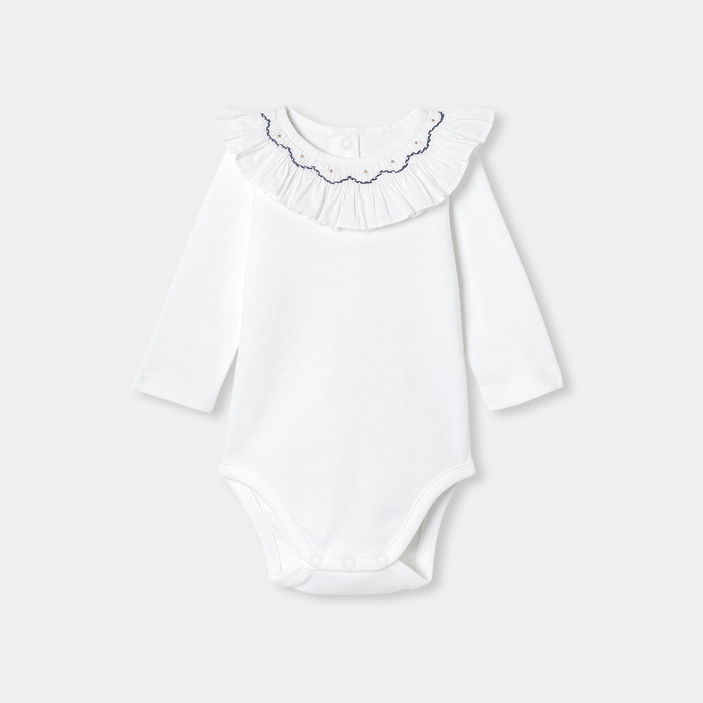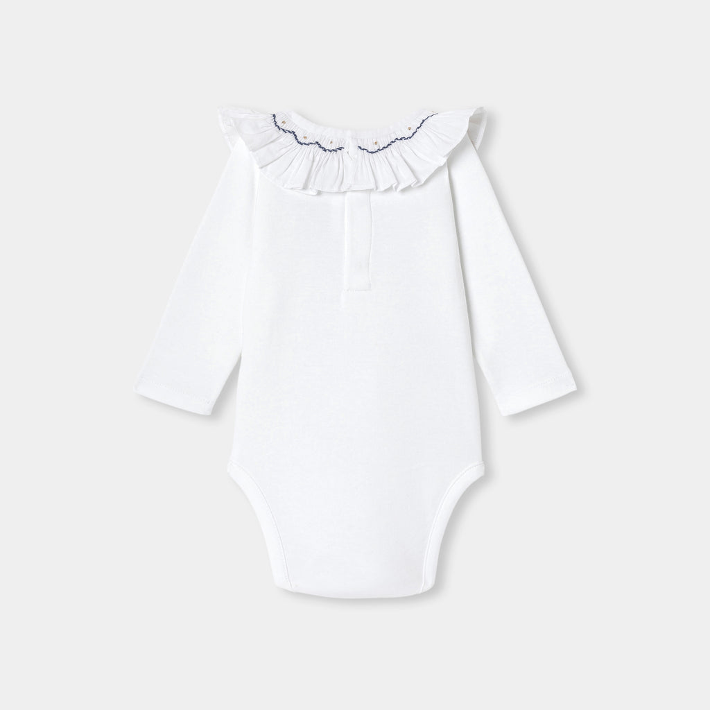 赤ちゃんの装いを美しく演出する、シックで洗練されたボディスーツ。柔らかで着心地の良いオーガニックコットンを使用したクラシカルなモデルで、手刺しゅうスモック入りのフリルが印象的。デニムワンピースやベロア調のサロペットとも相性抜群です。