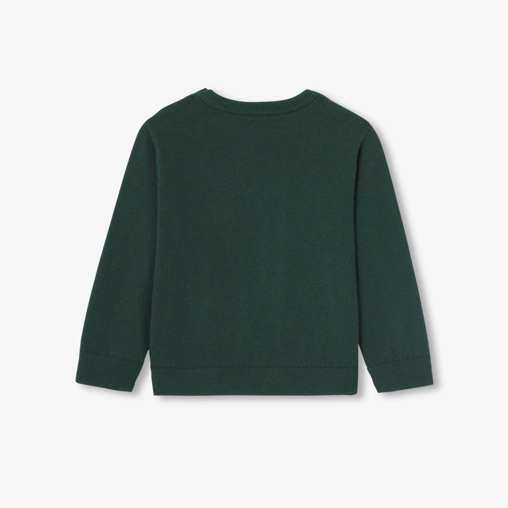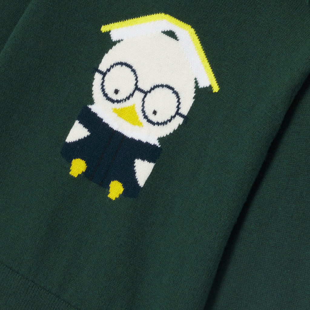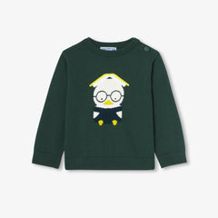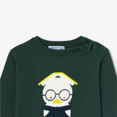 勉学の秋をイメージしたセーター。コットンとウールを使用しています。本に熱中するインターシャ織のアヒルが愛らしい一着です。肩に開きがある実用的なデザイン。ベロア調生地のパンツやジーンズと合わせやすく、プレッピーなシルエットが楽しめます。