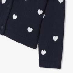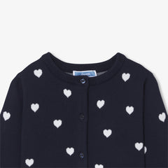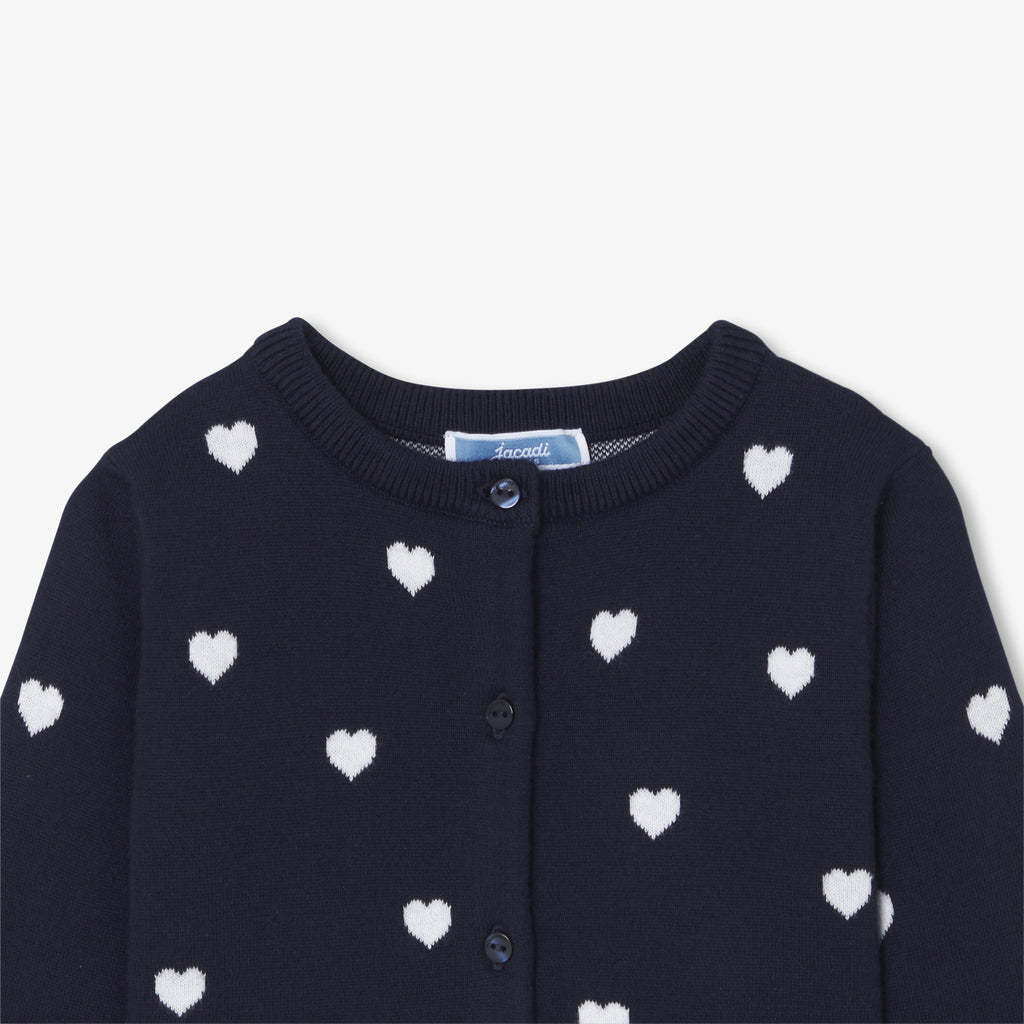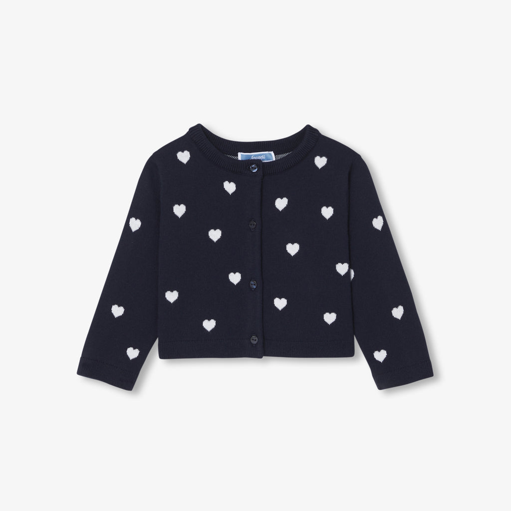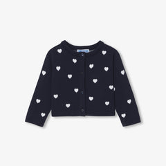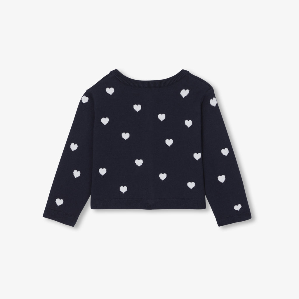 ソフトでしなやかなオーガニックコットンとジャガード織のハートが魅力のカーディガン。ボタンで開閉するため着脱も簡単。お揃いのパンツ(別売り)と合わせれば、統一感のある優しげなコーディネートに。