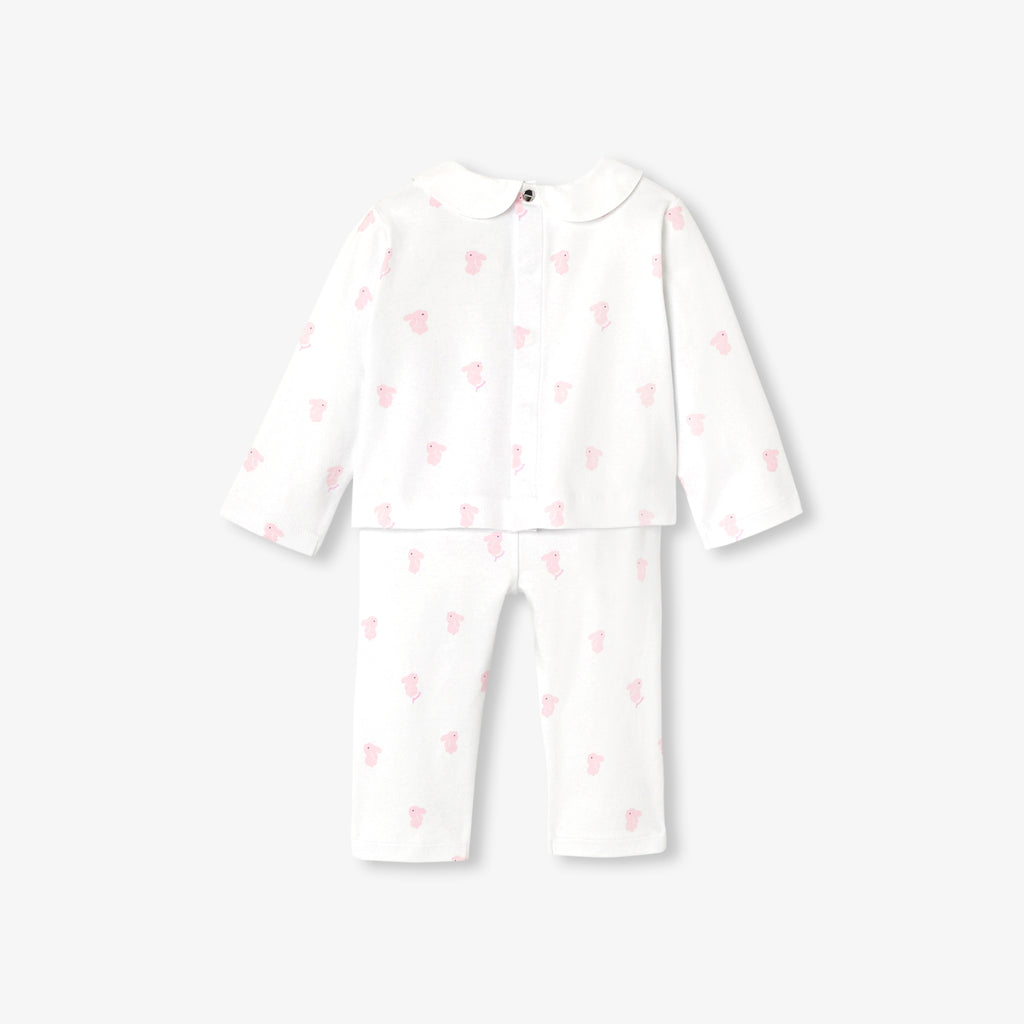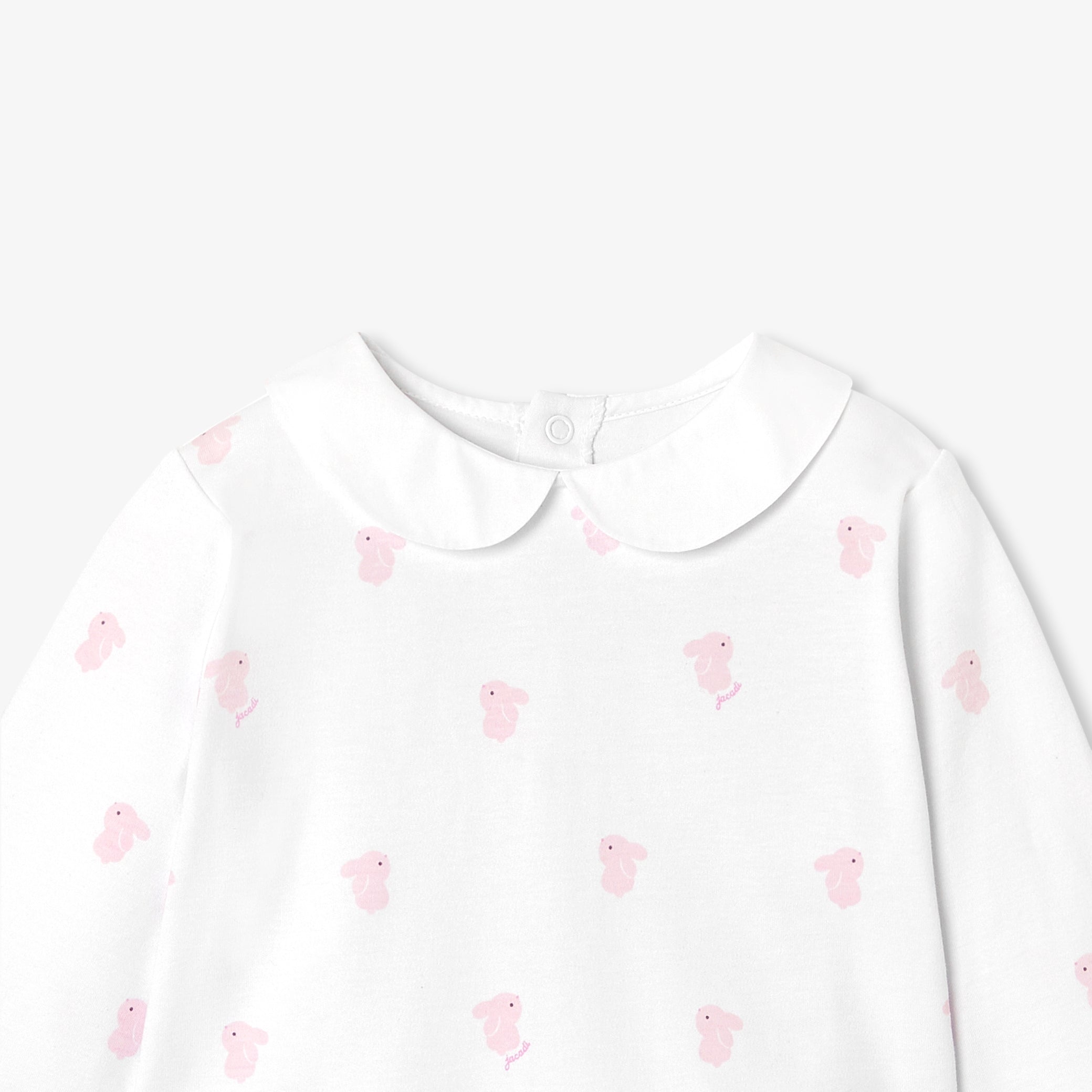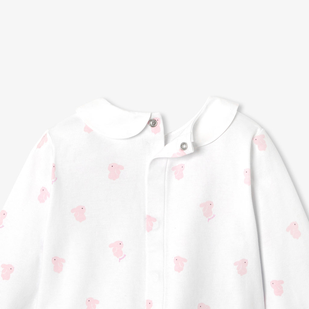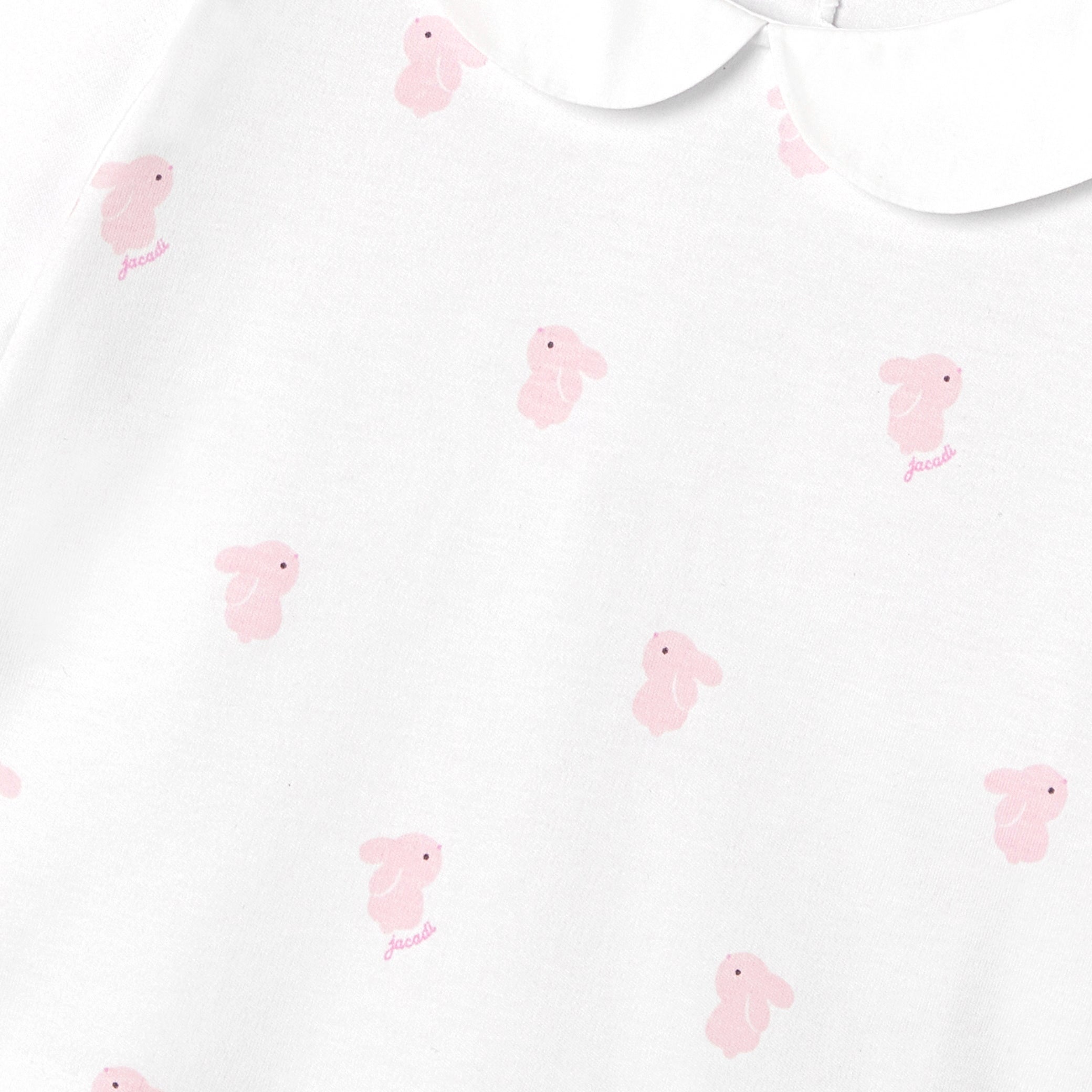 小さなうさぎのモチーフと、エレガントなポプリン素材のピーターパンカラー(襟)をあしらったデザイン。