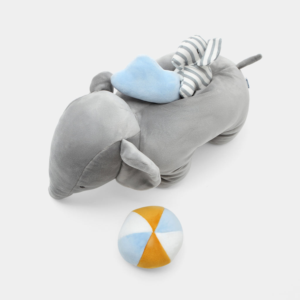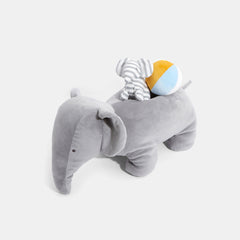 赤ちゃんの好奇心をかきたてるゾウのぬいぐるみ。ゾウの背中に小さなぬいぐるみやガラガラが入っており、さまざまな音が鳴る楽しいセットです。