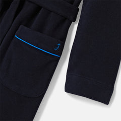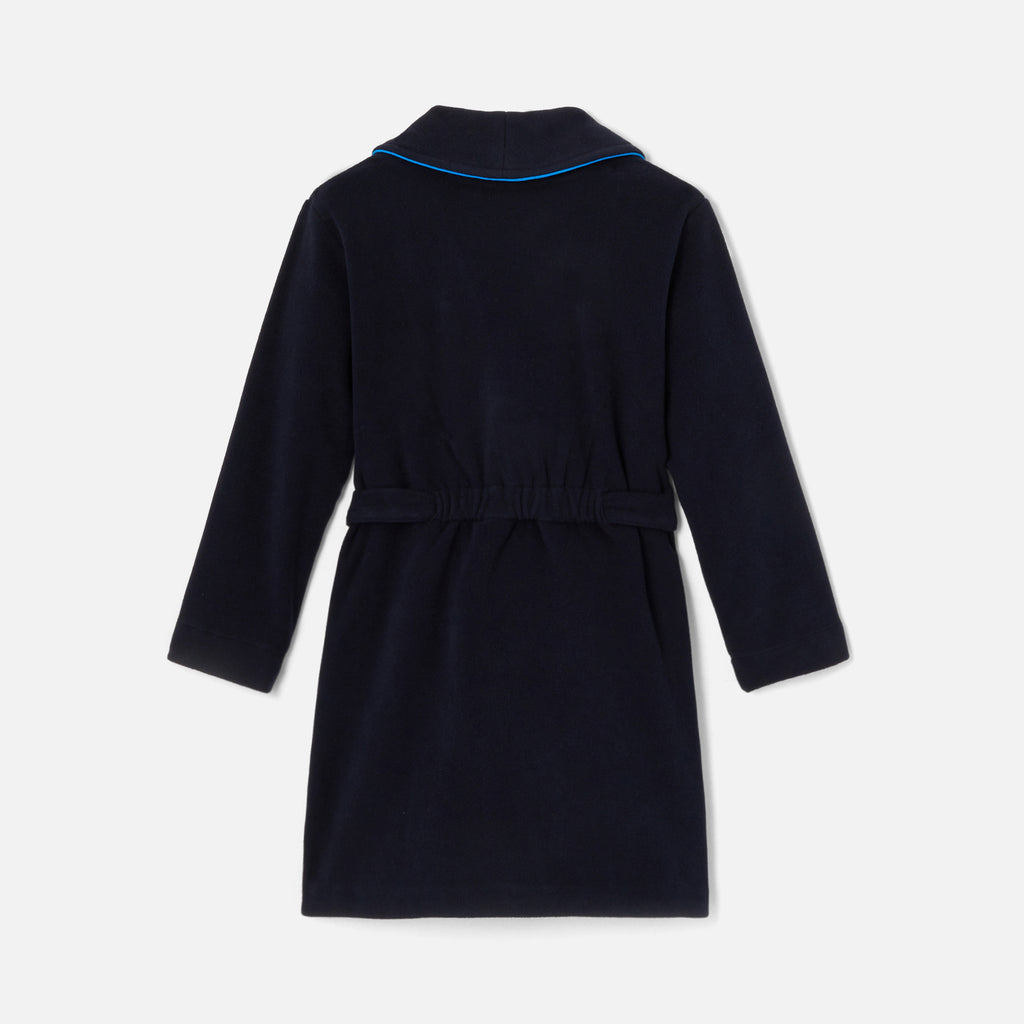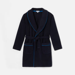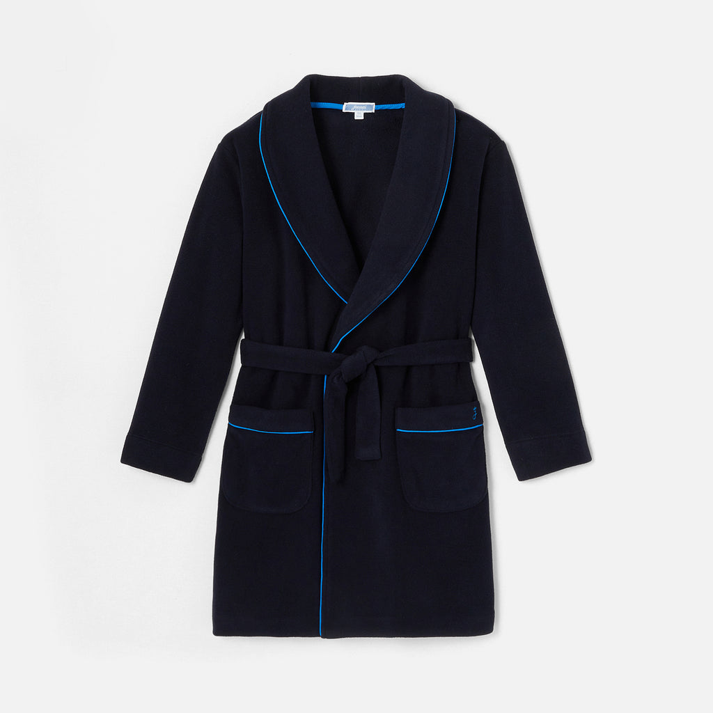 夜寝る前や朝起きてすぐパジャマの上に羽織ることができるエレガントなフリースガウン。パイピングがコントラストを際立たせ、ウエストを結ぶベルトとポケットが付いています。