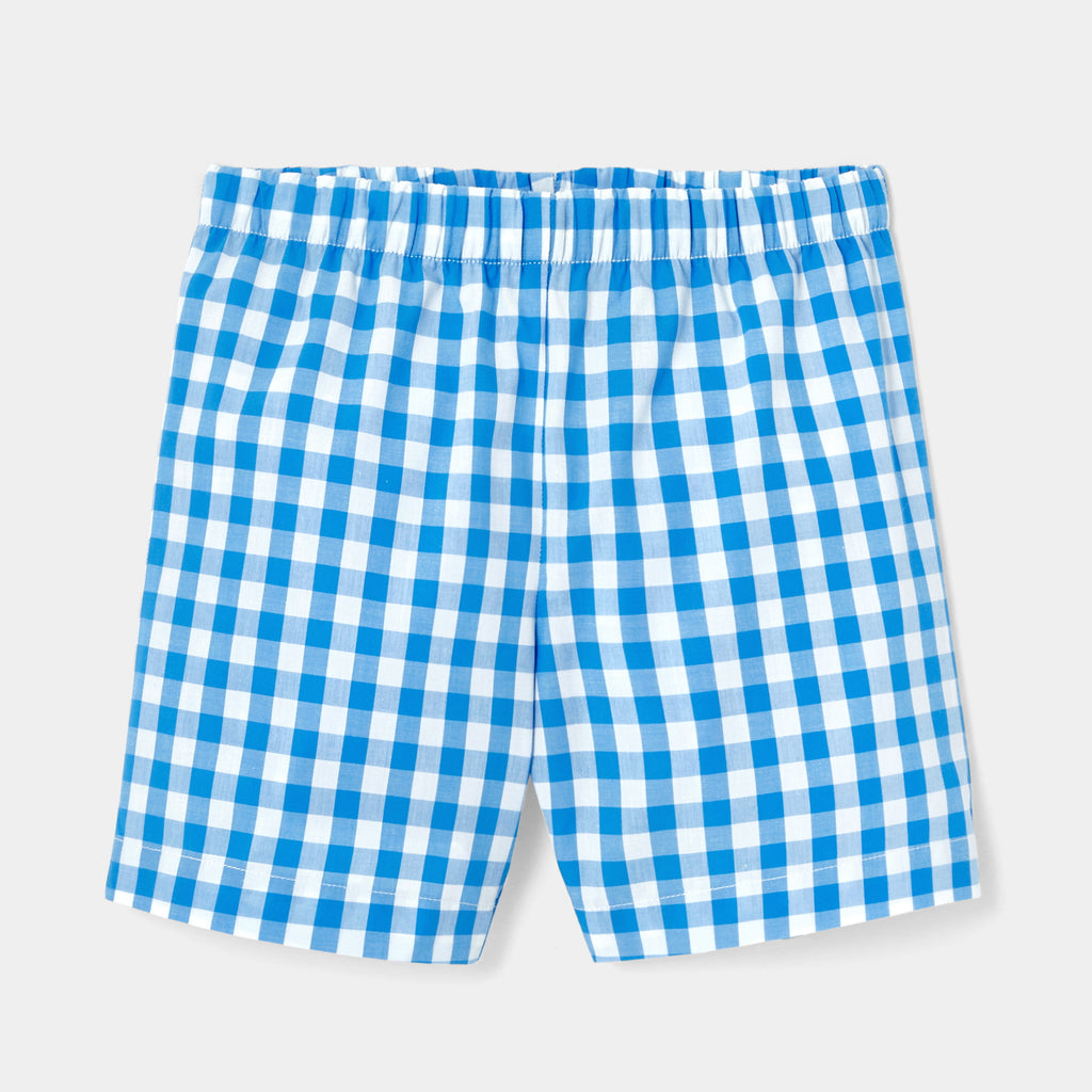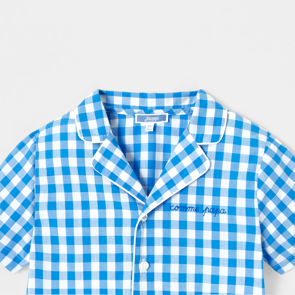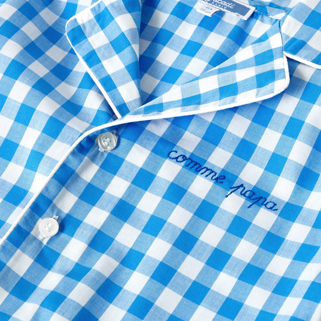 夏の夜をおしゃれで快適に過ごすギンガムチェックのショート丈パジャマ。ボタン留めのシャツとウエストゴム入りのショートパンツがセットに。胸元には"Comme Papa(パパみたいに)"の文字刺繍入り。