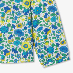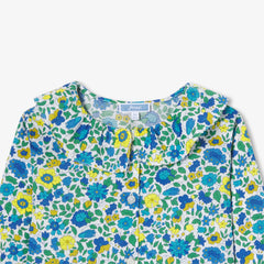 楽しいリバティプリント(花柄)とギャザーフリルの、正統派でカラフルなブラウス。新学期にぴったりです。ベロアスカートと合わせればエレガントに、ワイドレッグのジーンズと合わせればモダンに。プレッピーなコーディネートには欠かせない一枚です。