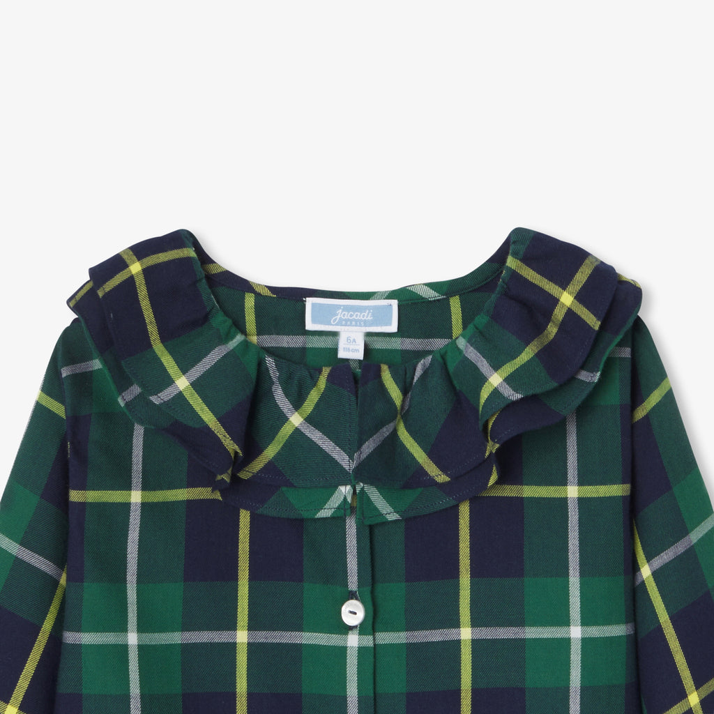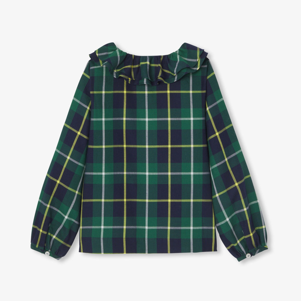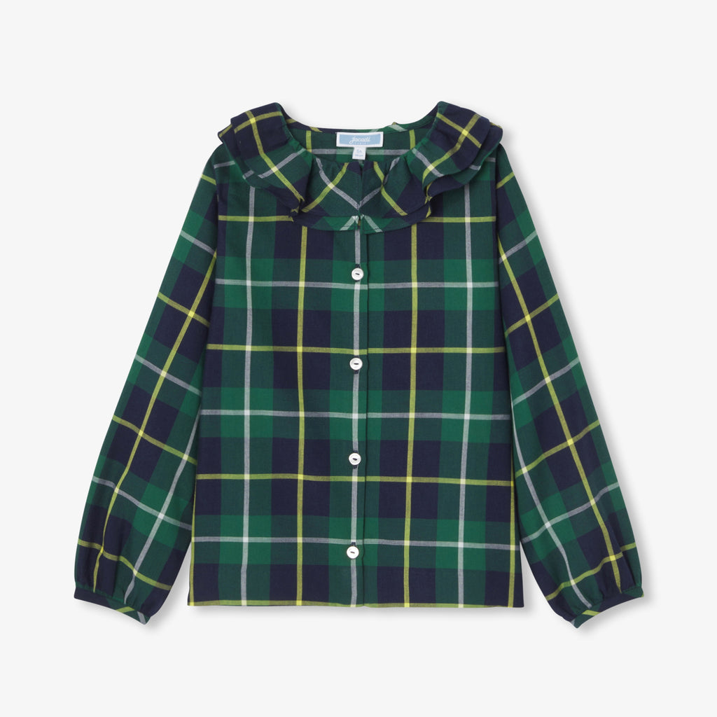 タータンチェック柄がモダンなシルエットを際立たせる、プレッピーシックなブラウス。柔らかなフランネル素材で、襟付きのデザインです。ベロアスカートとハイソックスを合わせればスクールルック風に、セーターとジーンズ、スニーカーと合わせればモダンに。様々な着こなしが可能です。