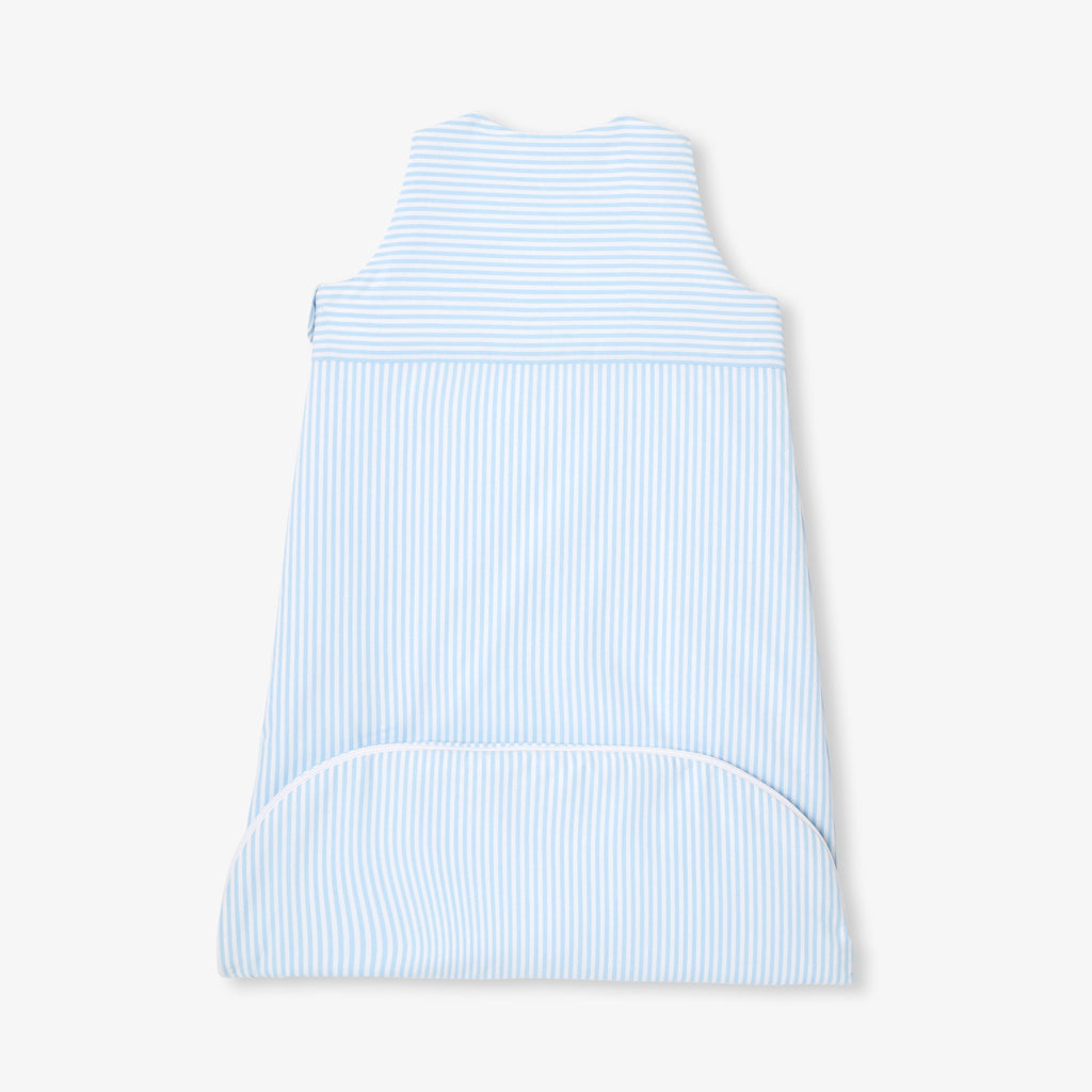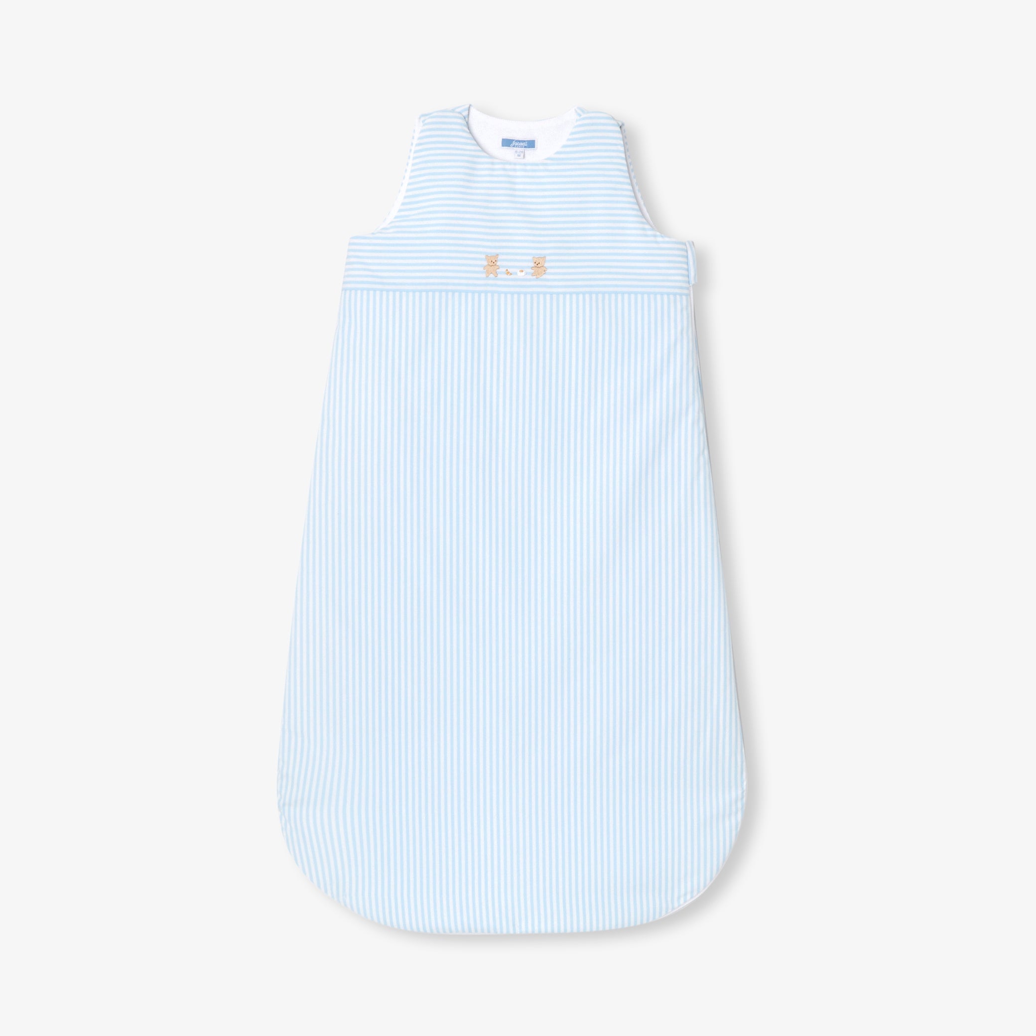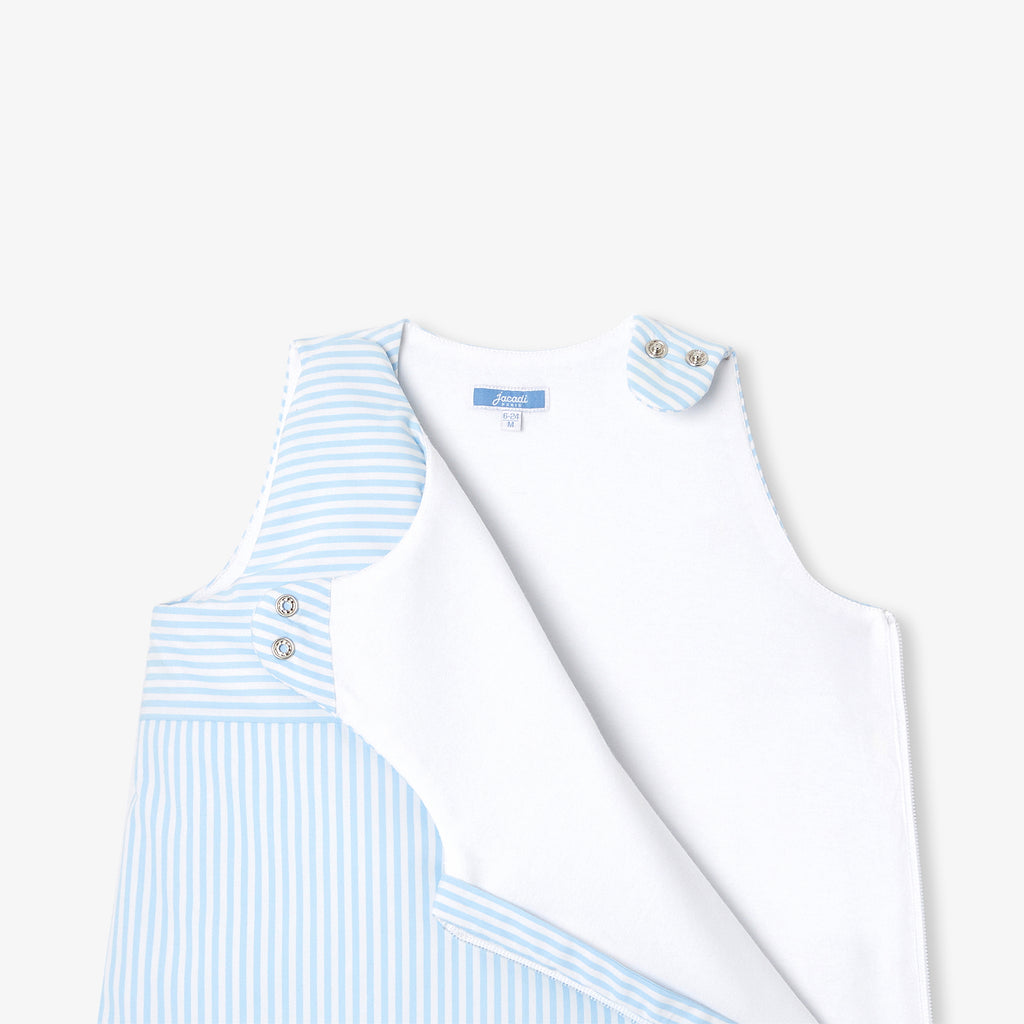 爽やかなストライプのコットンポプリン生地に、おやつを楽しむクマさんの手刺しゅうを添えた、遊び心あふれるスリーパーです。