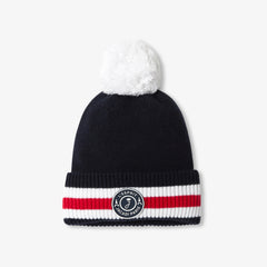 快適でスタイリッシュ、暖かなビーニー帽子。普段使いに最適な、二重構造のジャージー製です。ストライプの折り返し、シリコンのロゴ、白いポンポンが特徴。寒い季節のマストアイテムです。