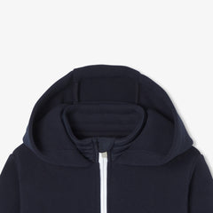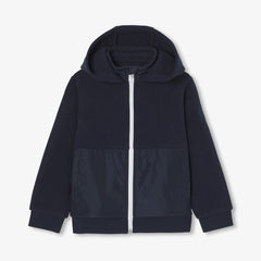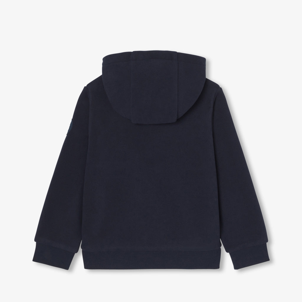 柔らかく暖かいマイクロフリースがモダンなジップアップスウェット。秋の初めの定番アイテムです。ナイロン製のポケットと袖の刺しゅうバッジが都会的な、スポーティーシックな一着。Tシャツとジーンズの上に羽織れば、きっとお子さまのお気に入りに。
