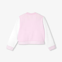コントラストの効いたカラーブロックデザインの袖、胸元のバッジ、スナップボタン、ストライプのリブ編みのディテールが新鮮な印象のモダンな一着です。