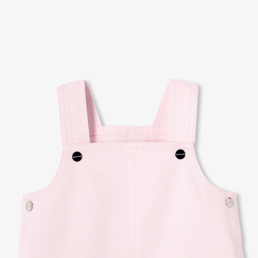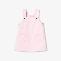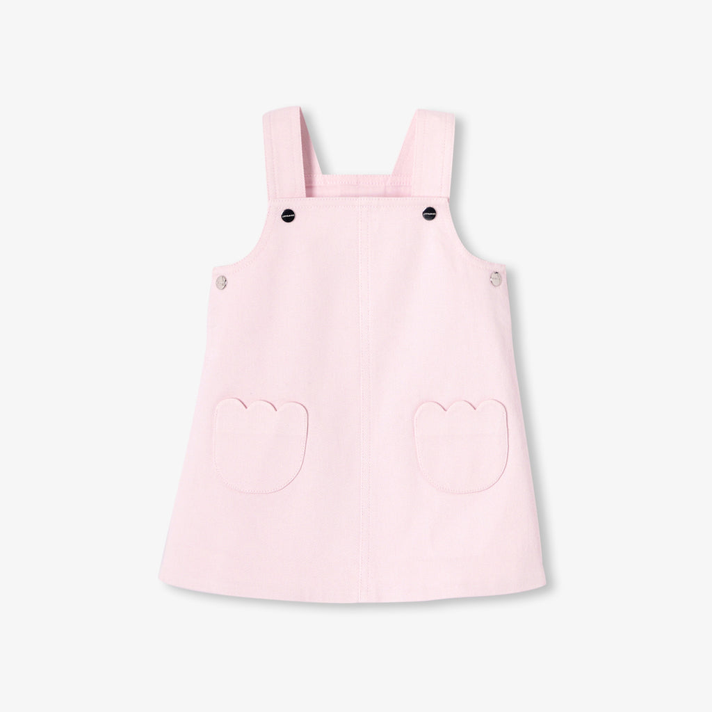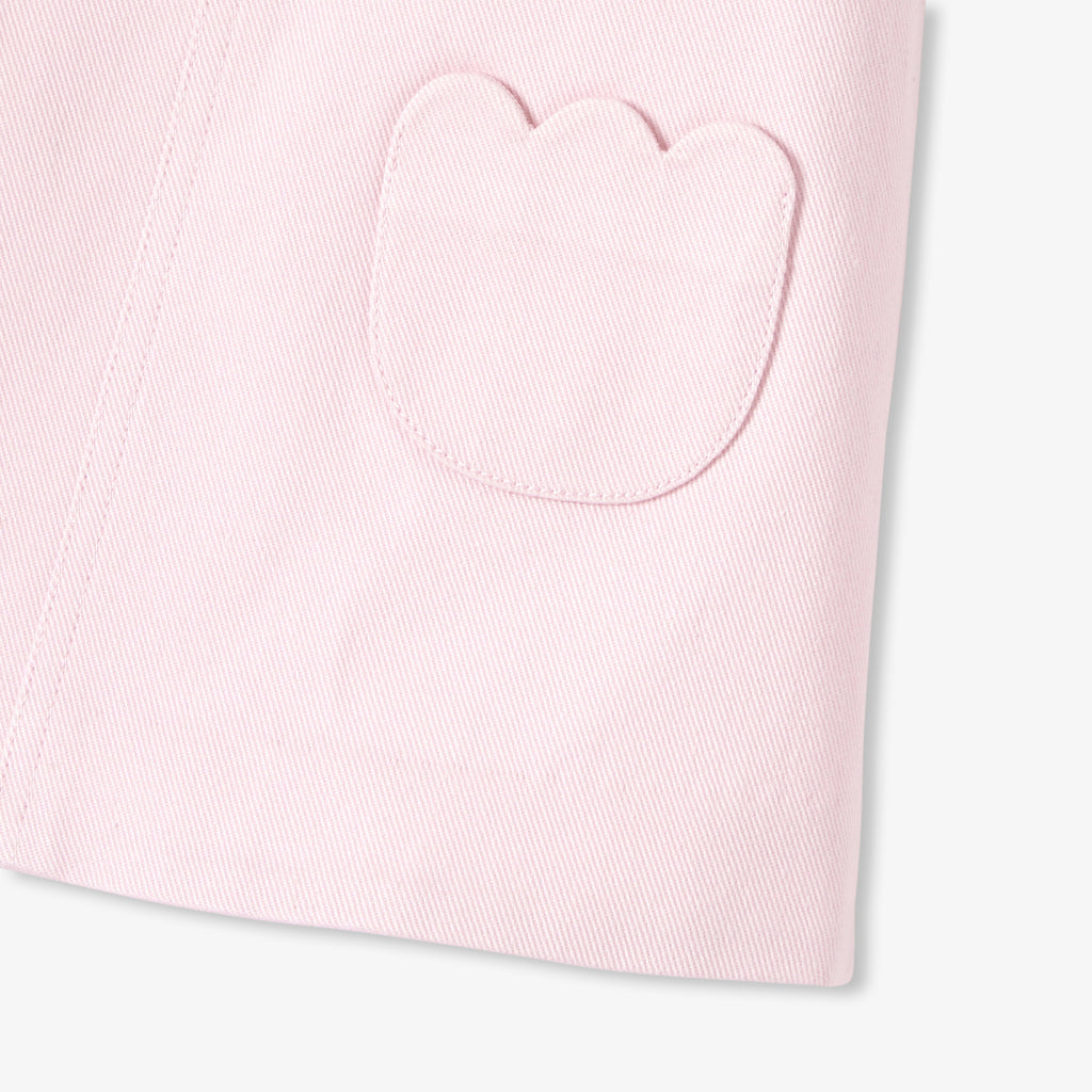 スナップボタン留めのストラップと、可愛らしいフラワー型のポケットが印象的な一着です。セーラートップスやフリル襟のボディスーツと合わせれば、シックでカジュアルな装いが完成します。