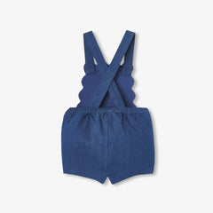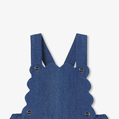 スカラップの胸当てと背中でクロスするストラップが印象的な一着。セーラー風のボディスーツやピーターパンカラー(襟)のTシャツと合わせれば、エレガントでモダンな装いに。ギフトにもおすすめのアイテムです。