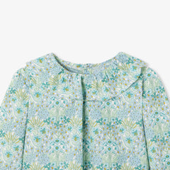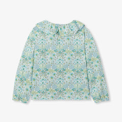 洗練された本格的な冬の訪れを感じさせるブラウス。リバティプリント(花柄)を使用し、スカラップ襟、正面のプリーツ、伸縮性のある袖口がエレガンスを引き立てます。ベロアパンツとシルバーの中綿ジャケットに合わせれば、家族でのお出かけにぴったり。