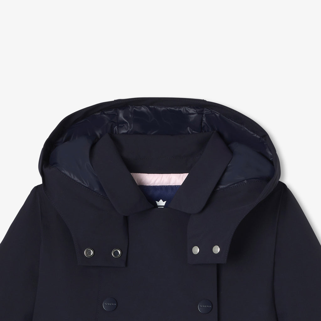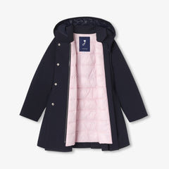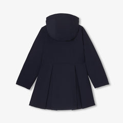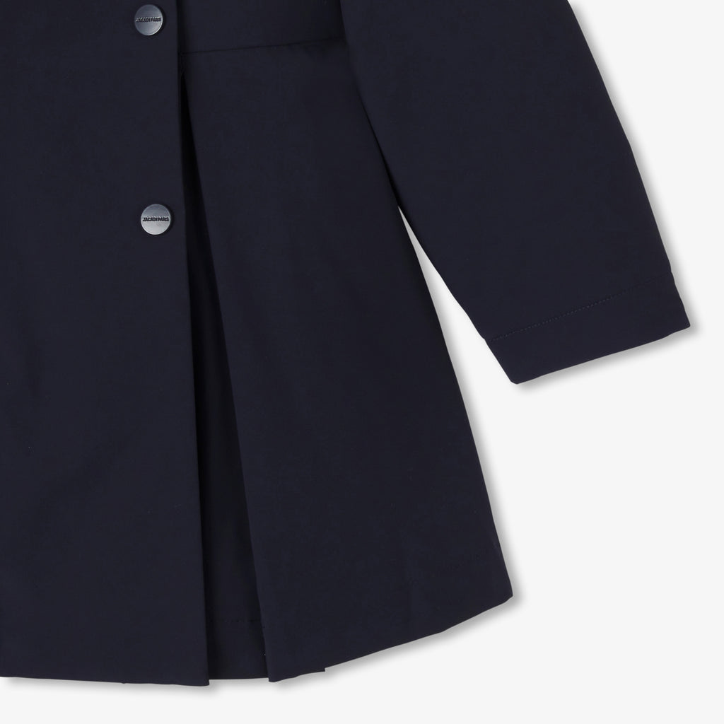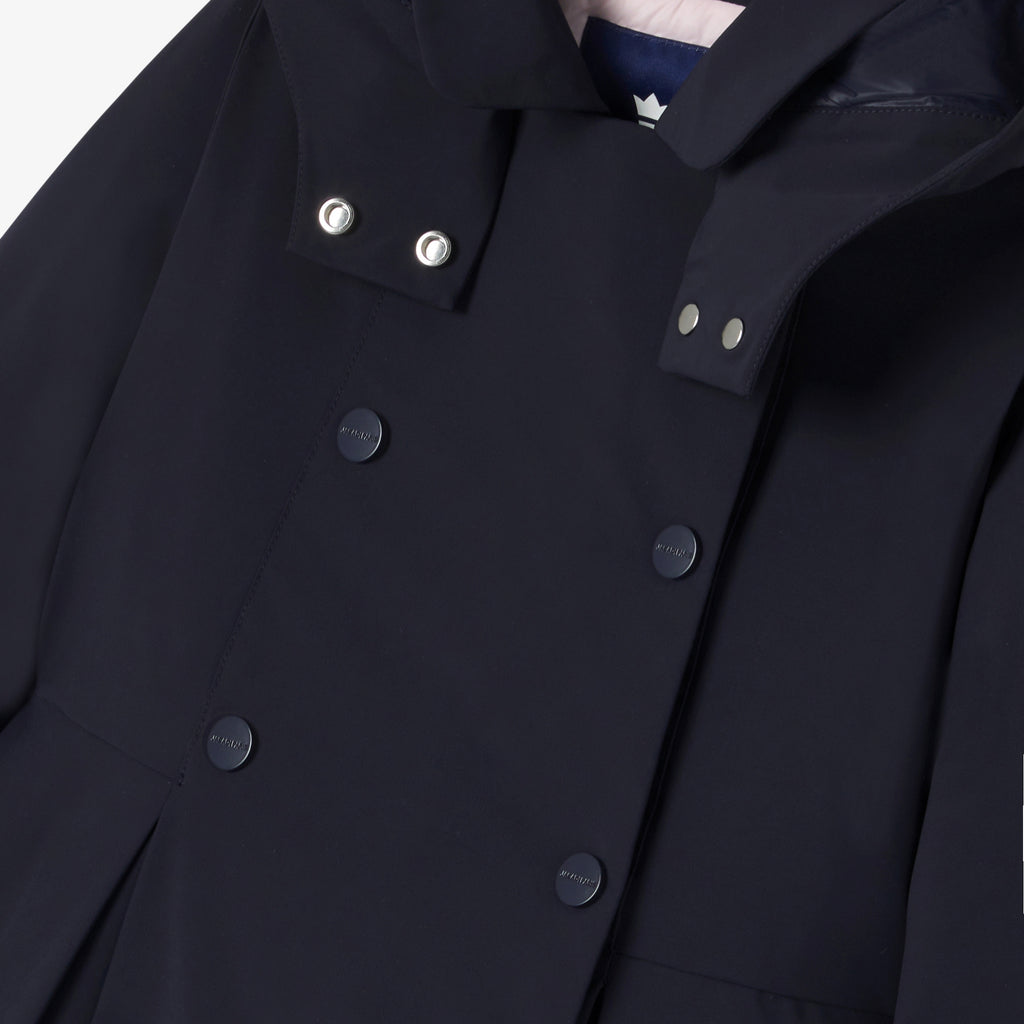 通園・通学のマストアイテム、レインコート。前を開いても閉じても着られる、エレガントなトレンチコート風のデザインです。コントラストの効いたキルティングの裏地とボックスプリーツの裾が魅力。ゆったりとしたジーンズやブラウスと合わせてプレッピーシックに、ワンピースと合わせてフェミニンに。どちらのスタイルにも馴染むタイムレスな色合いが日常の装いを引き立ててくれます。