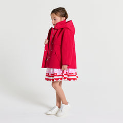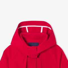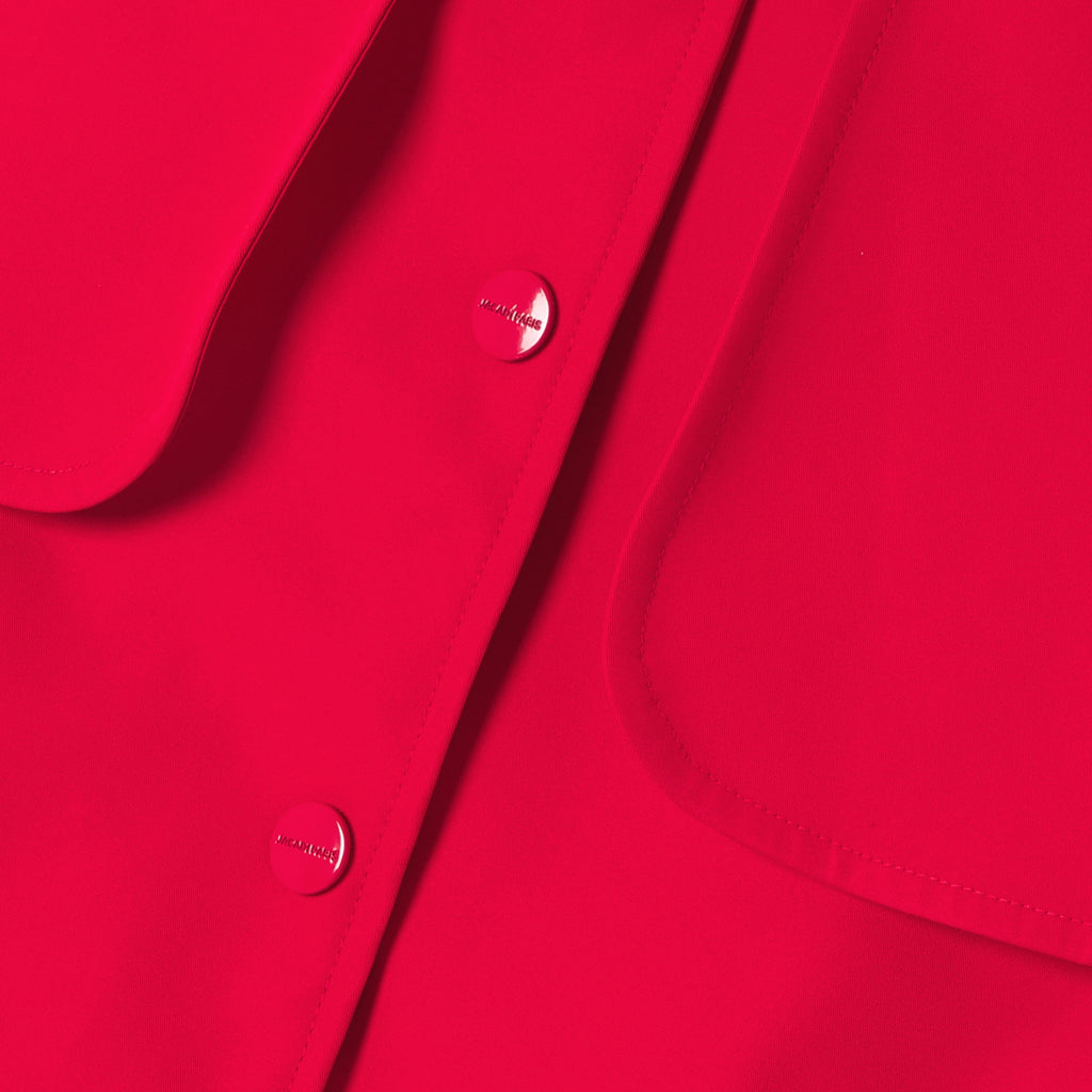 鮮やかな赤色と白いラインが特徴のショートトレンチコート。ジャカディの洗練されたスピリットを体現した一着です。