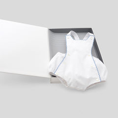 "My First Jacadi(マイファーストジャカディ)"は、ジャカディのこれまでのデザインにインスパイアされたアイコニックなモデルの限定ボックス。クラシカルなモデルを現代向けにリデザインした、ニューモデルのブルマが目を惹きます。コットンピケを使用し、コントラストの効いたステッチとバッククロスストラップが、タイムレスでシックな一着を美しく仕上げています。