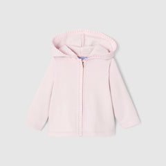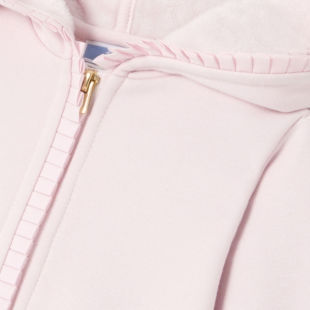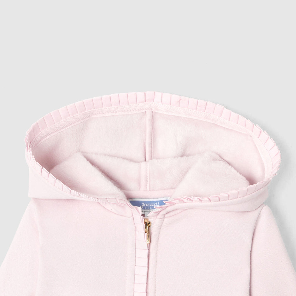 ミニマルカットの上品なジップアップカーディガン(パーカー)は秋の始まりにぴったり。フード・ファスナー縁のフリルが可愛らしいデザインです。