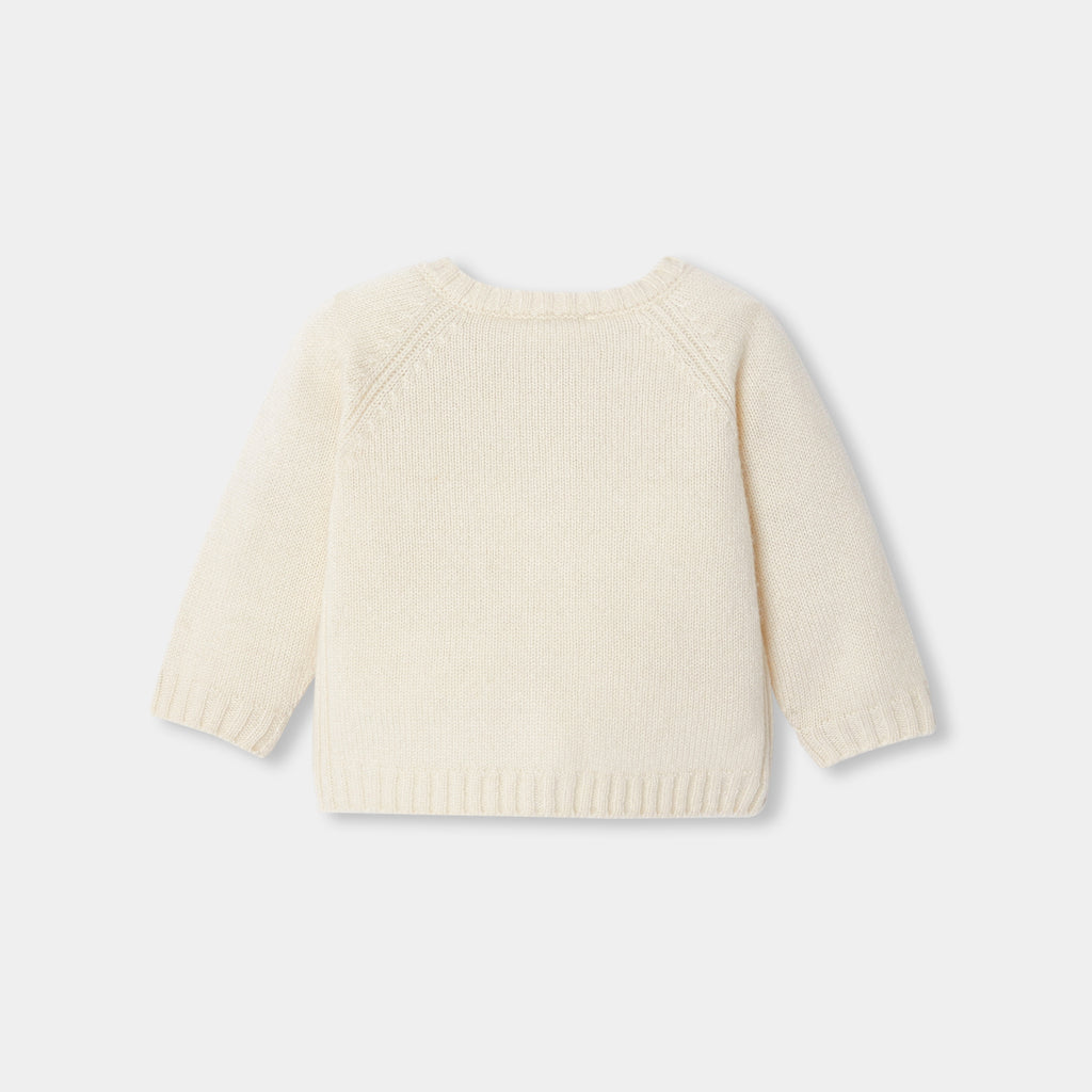 赤ちゃんの初めてのワードローブにぴったりの、上品なカーディガン。柔らかなカシミヤを使用しており、リブ編み、ラグラン袖、ボタンがポイントに。シックでスリムなデザインで、お揃いのショートパンツ(別売り)と合わせれば、美しい秋のシルエットが完成します。