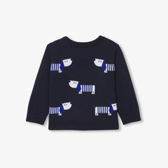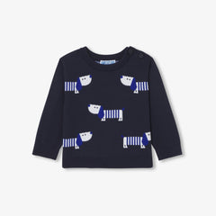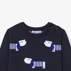 肌寒い季節のワードローブの定番アイテム、コットンセーター。セーラーストライプのTシャツを着た小さな犬のモチーフで彩られています。ソフトでしなやかな両面ニット製で、肩口はボタン式プラケット。ロールアップしたジーンズとアンクルブーツを合わせれば、シックなパリ風カジュアルのシルエットに。
