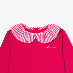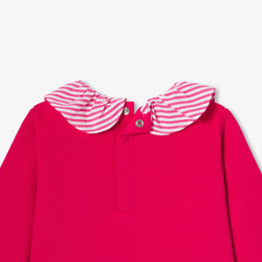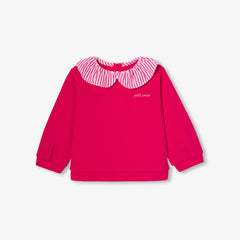柔らかなフリースの着心地とストライプフリルのモダンなエレガンスが融合したスウェット。背中のスナップボタンで着脱も簡単です。ジーンズとスニーカーに合わせれば、カジュアルなシルエットがすぐに完成。ミッドシーズンのマストアイテムです。