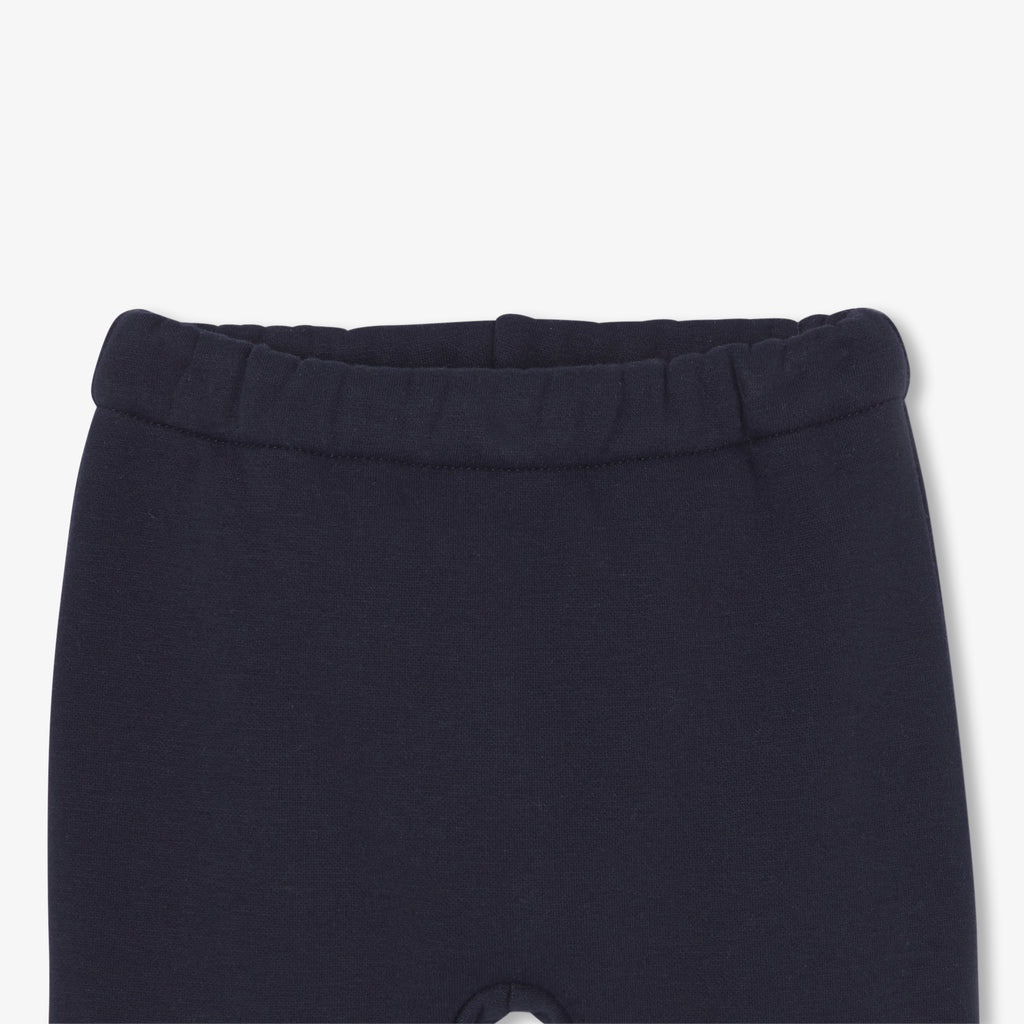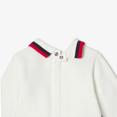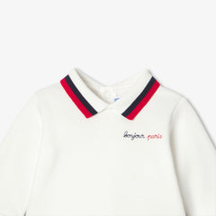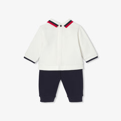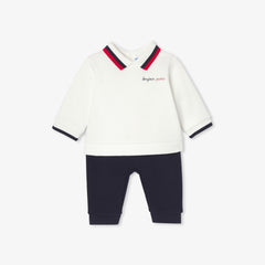スポーティーシックで実用的な秋向けのアンサンブル。柔らかで着心地の良いフリース素材を使用しており、背面開きのポロ襟付きのスウェットと、伸縮性のあるウエストゴム入りのパンツが上下セットになっています。ご自宅用にもギフトにもおすすめで、保育園やご家庭で重宝しそう。