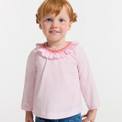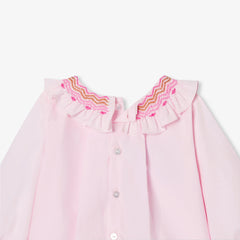 繊細なディテールが魅力のブラウス。手刺しゅうのスモッキングが施された、可憐なコットンポプリンの襟が目を引く一着です。ワンピースやパンツに合わせれば、シックで正統派のシルエットに。