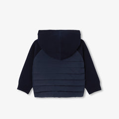 シーズン初めのアウターとしてデザインされた、丁寧な仕立てが魅力の一枚です。中綿入りのナイロンを使用したユニークなスタイル。袖とフードには柔らかく着心地の良いニット素材を使用しました。