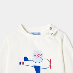 柔らかく着心地の良いスウェット。今シーズンは、アビエーター姿の猫のモチーフがデザインのポイントです。肩のスナップボタンでお着替えも簡単。